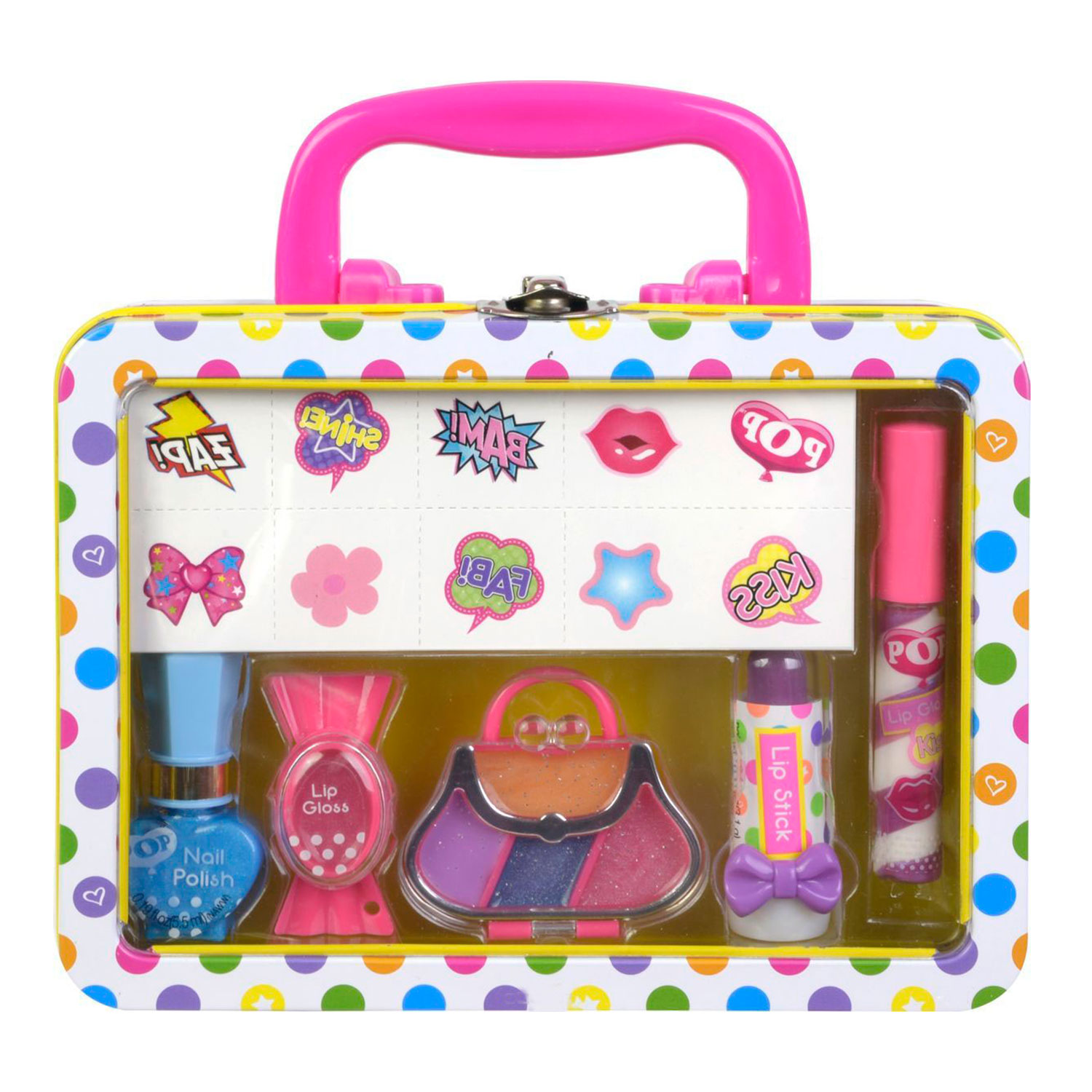 - набор выглядит просто потрясающе, все составляющие помещены в удобный чемоданчик с ручкой, который оснащен специальным замком, поэтому девочка не потеряет косметику.- блески и лак для ногтей тоже выглядят ярко, девочка сможет почувствовать себя настоящим визажистом