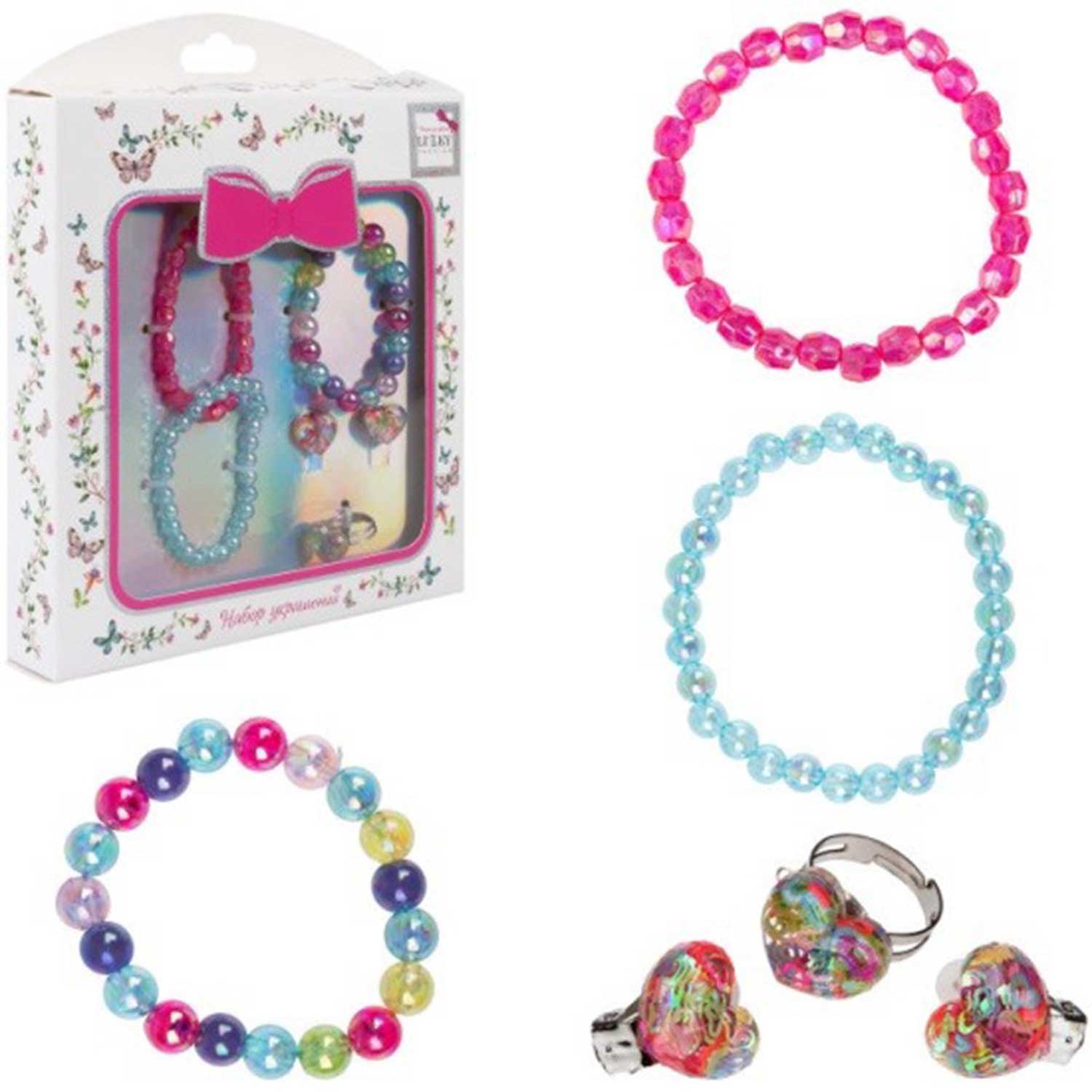 - в набор входи 3 браслета из цветных бусин, колечко и клипсы в виде сердечка