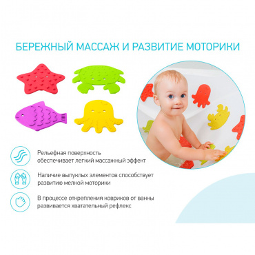 - развивашка: мало того, что это тренажер для развития мелкой моторики и хватательных рефлексов, с мини-ковриками от ROXY-KIDS ваш малыш познакомится с названиями морских обитателей (в комлекте рыбка, осьминог, краб и морская звезда) и выучит основные цвета