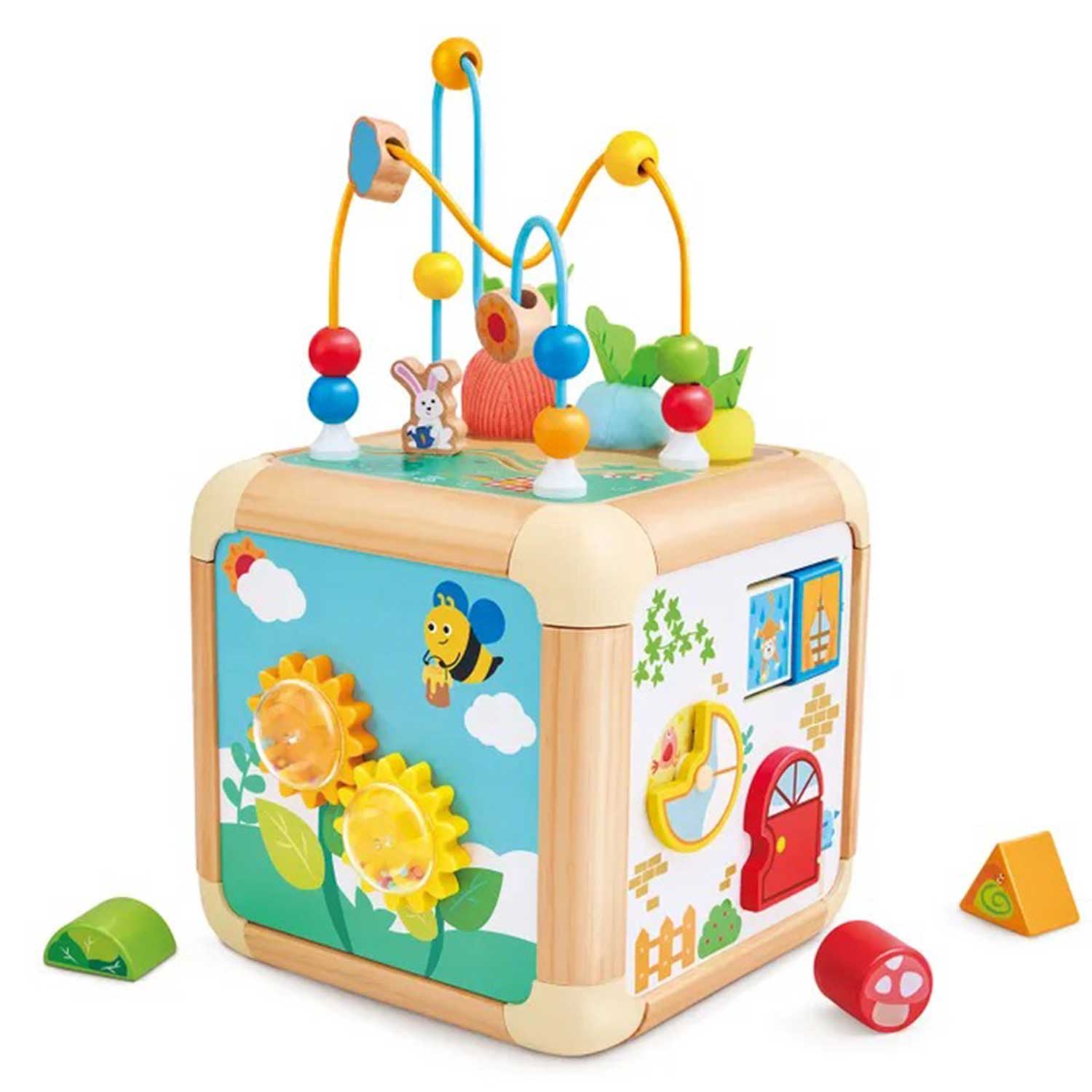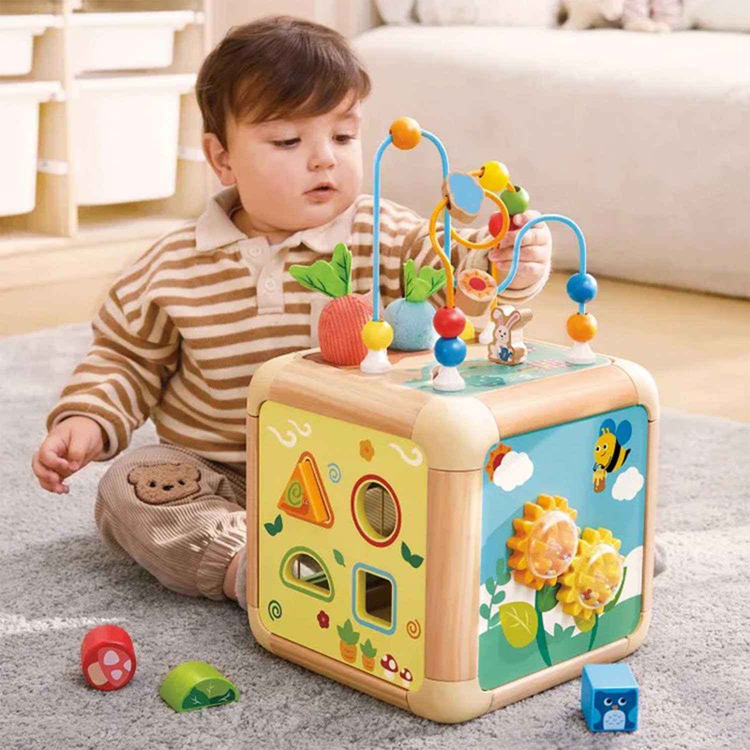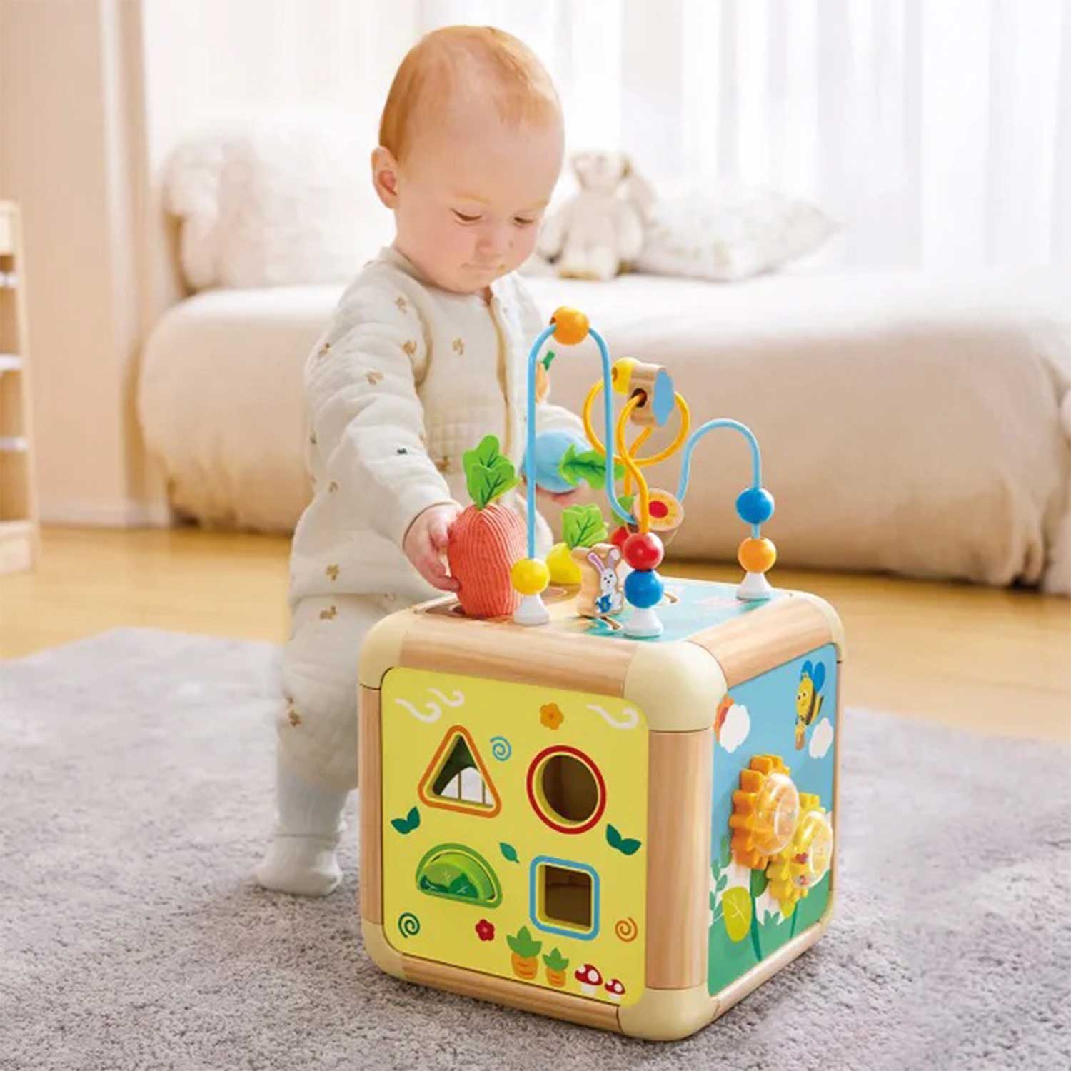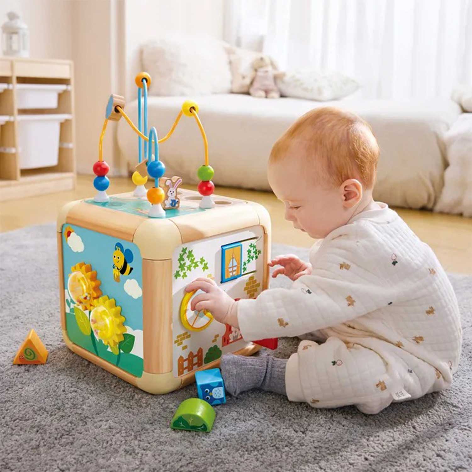 - элементы бизиборда: бусины, геометрические фигуры, изображения животных, сортер, открывающиеся дверцы и вращающиеся шестерёнки — всё это помогает ребёнку учиться различать формы, цвета и предметы