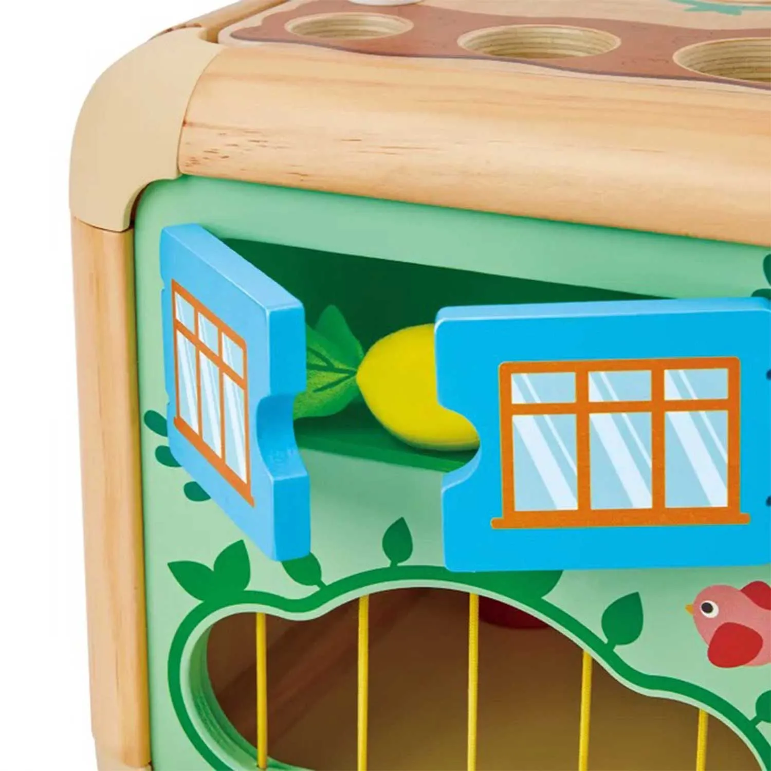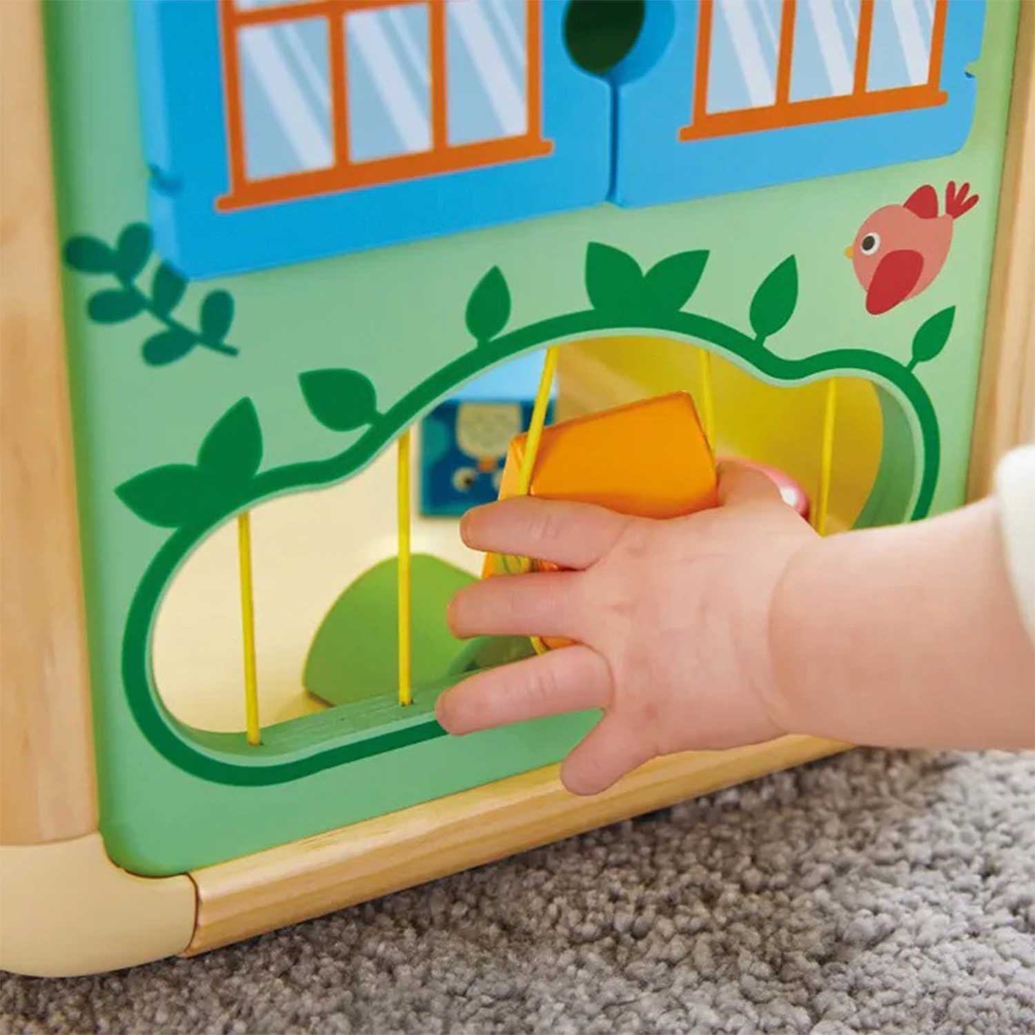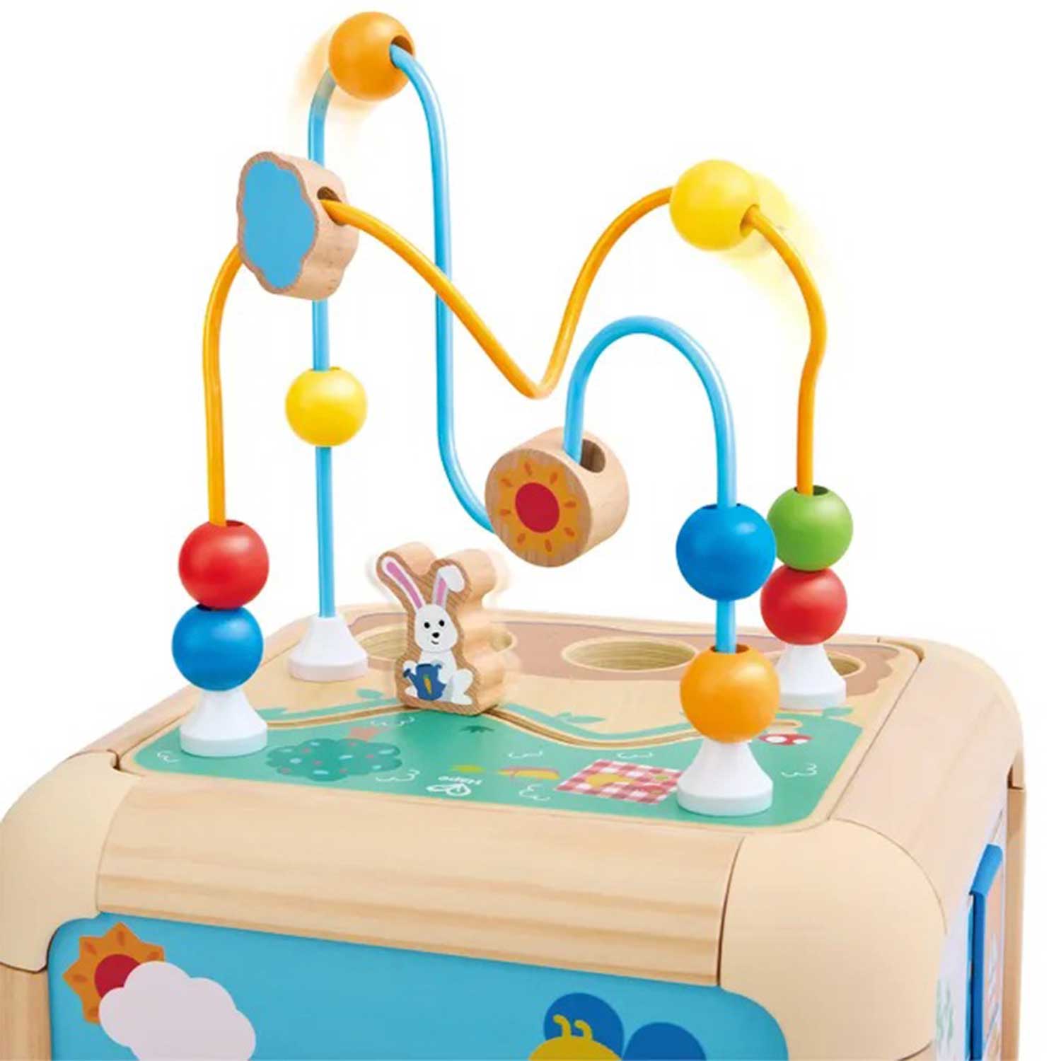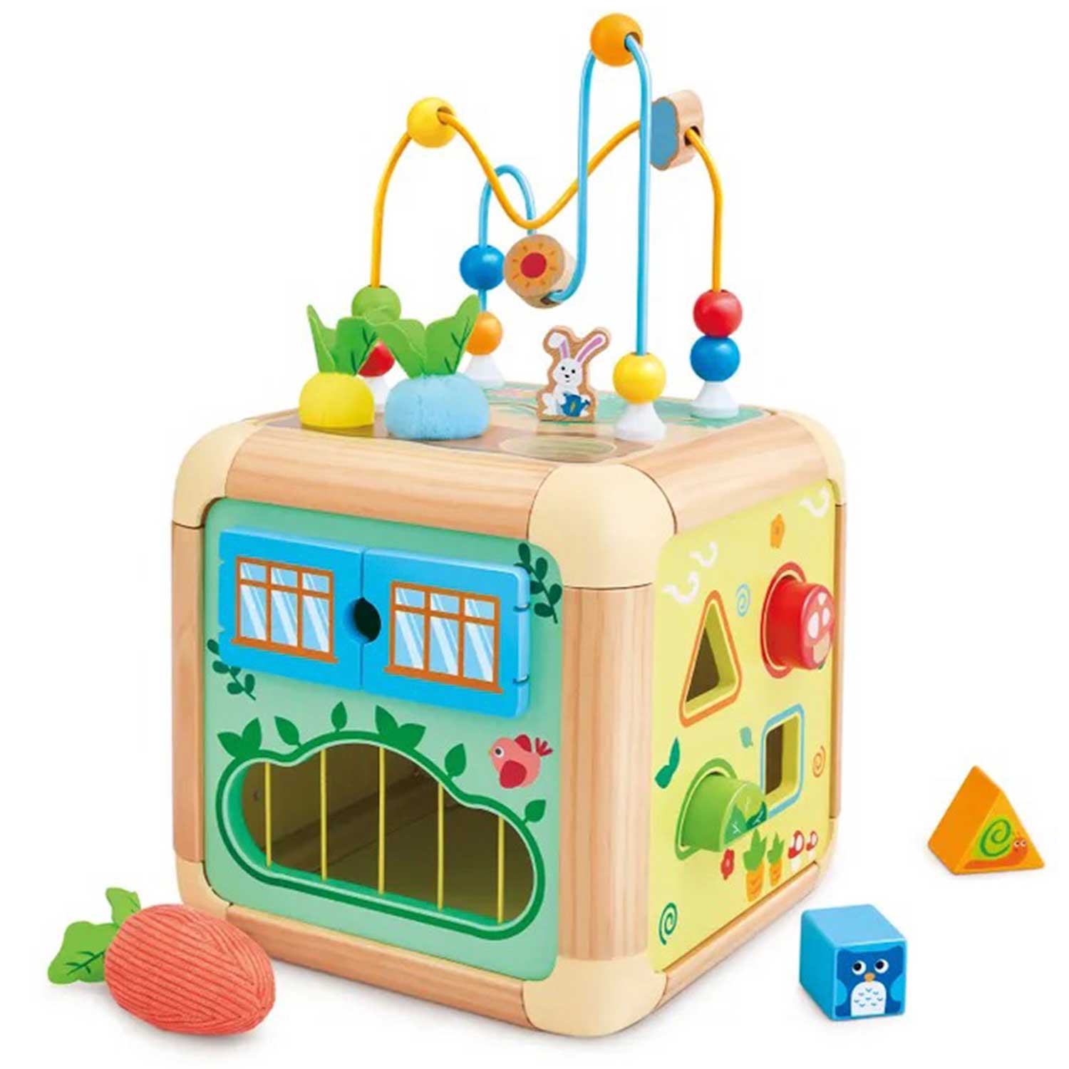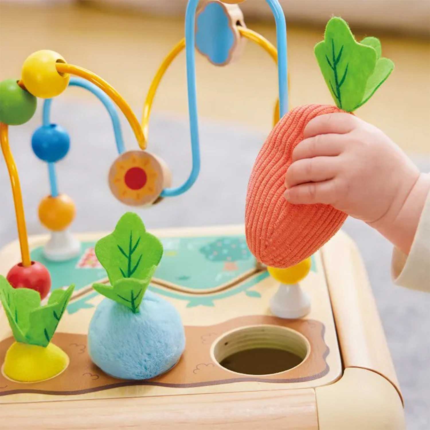 - элементы бизиборда: бусины, геометрические фигуры, изображения животных, сортер, открывающиеся дверцы и вращающиеся шестерёнки — всё это помогает ребёнку учиться различать формы, цвета и предметы