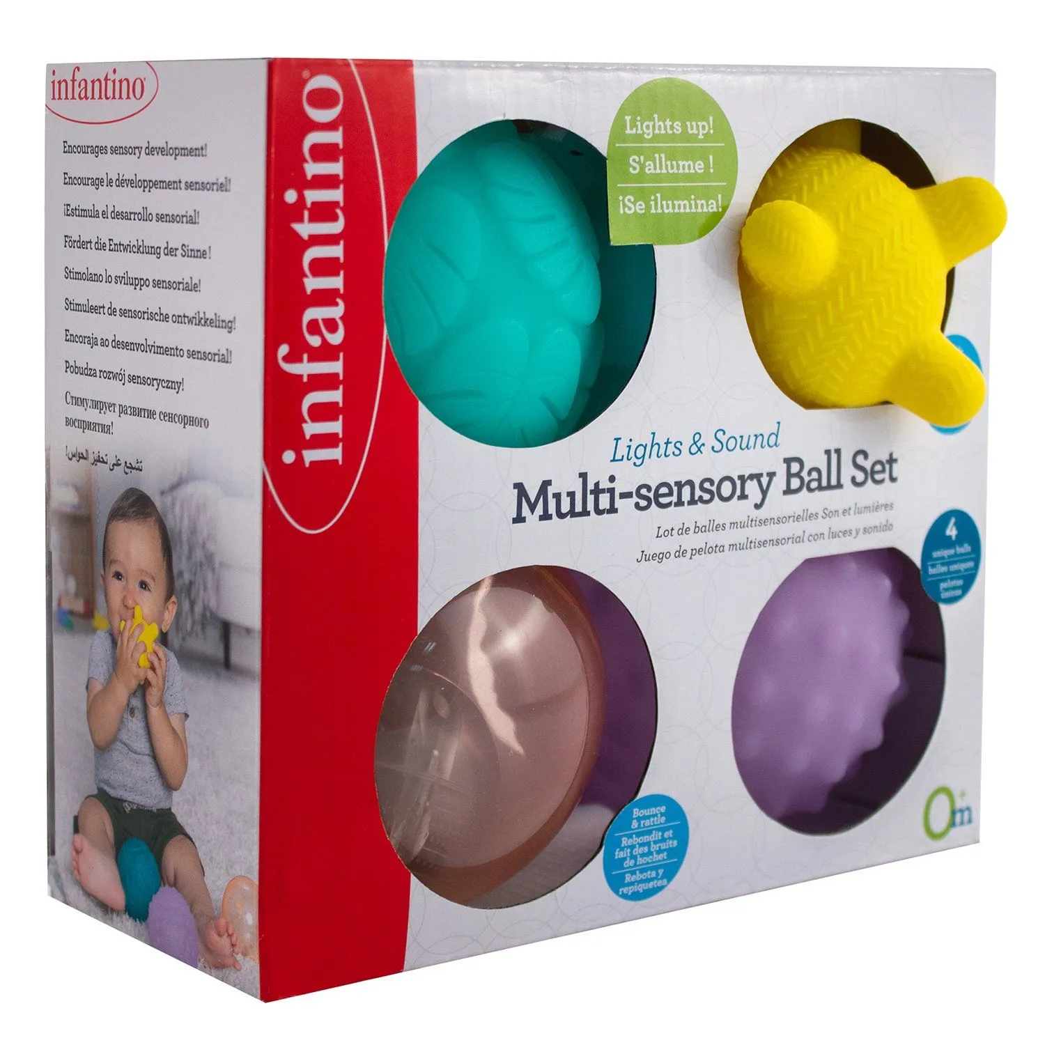 - четыре мультисенсорных разноцветных мячика с различными структурами, в том числе со световыми и звуковыми эффектами