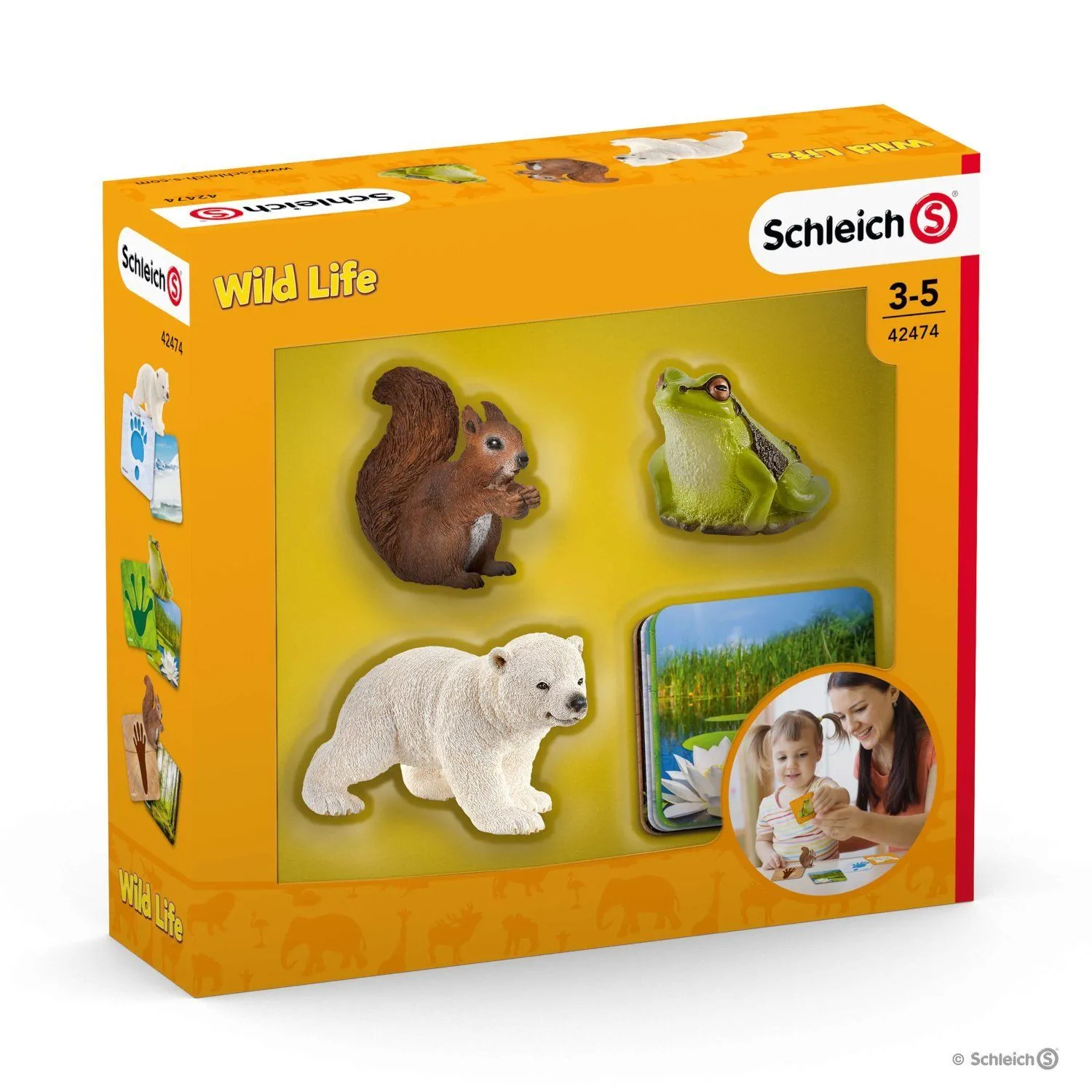 - набор предлагает детям поближе познакомиться с 3 животными: белым медведем, белкой и лягушкой, а также их следами и средой обитания.