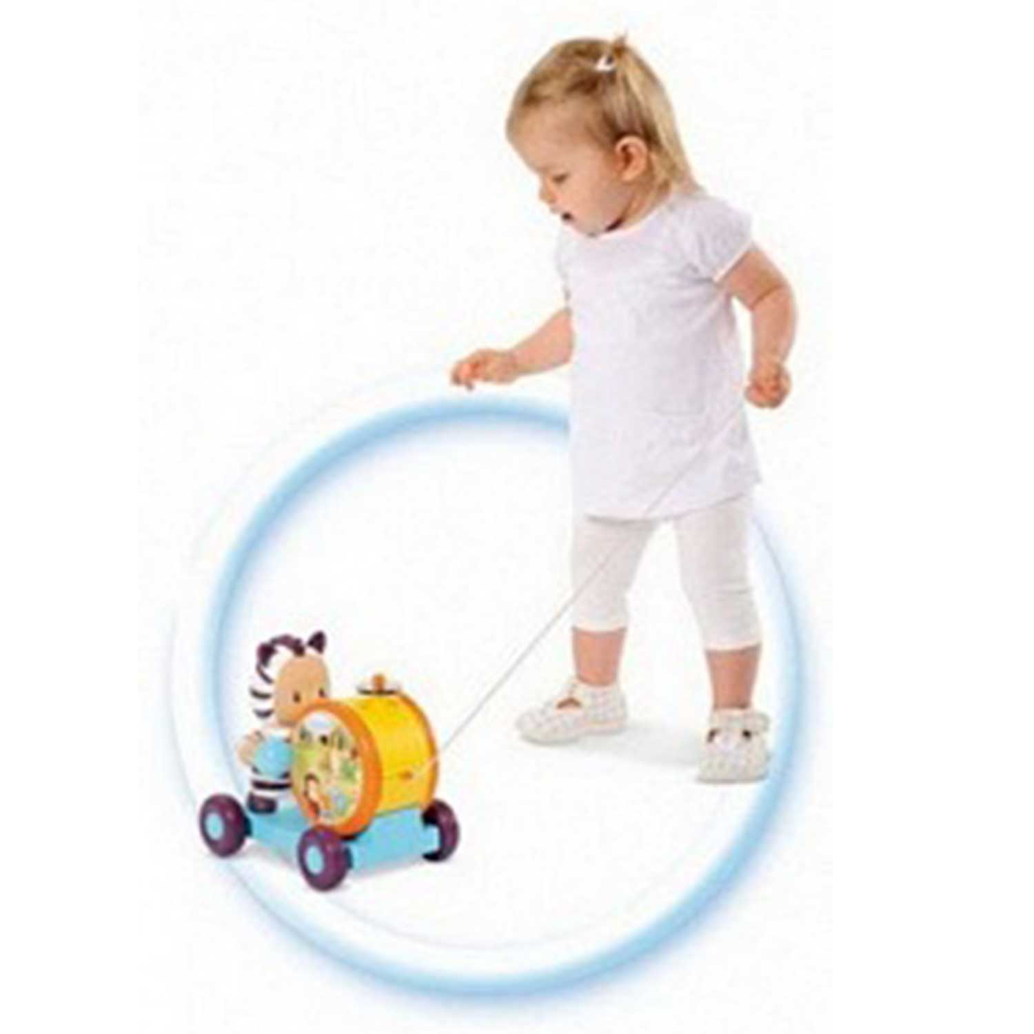 - каталка-тамбурин на платформе, снабжена веревочкой, за которую малыш сможет её вести