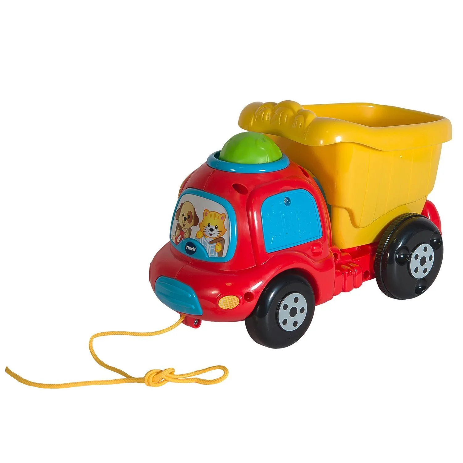 - игрушка напоминает миниатюрный самосвал с вращающимися колесами и откидывающимся кузовом на корпусе