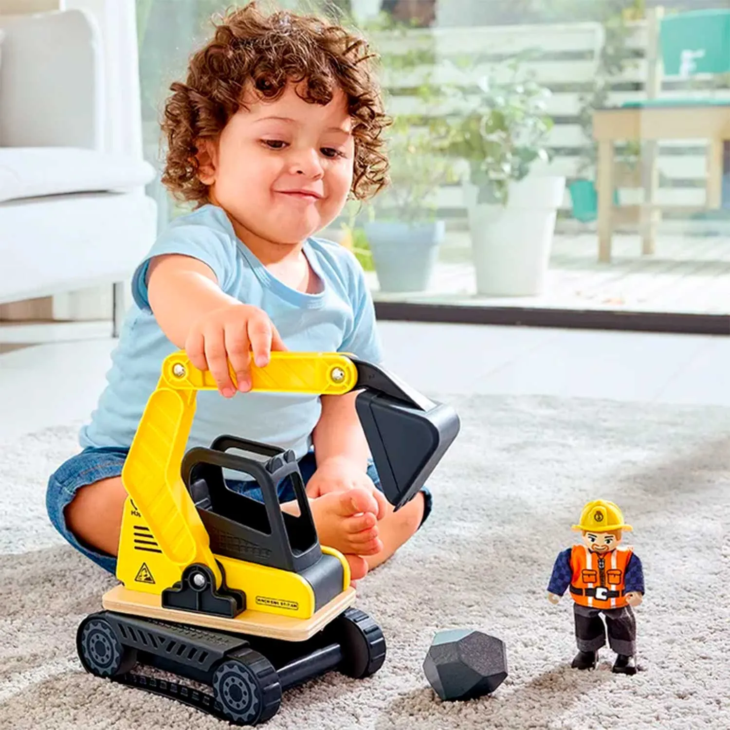 - дети могут посадить рабочего на сиденье водителя и загрузить камень с помощью захвата экскаватора, имитируя настоящую строительную работу