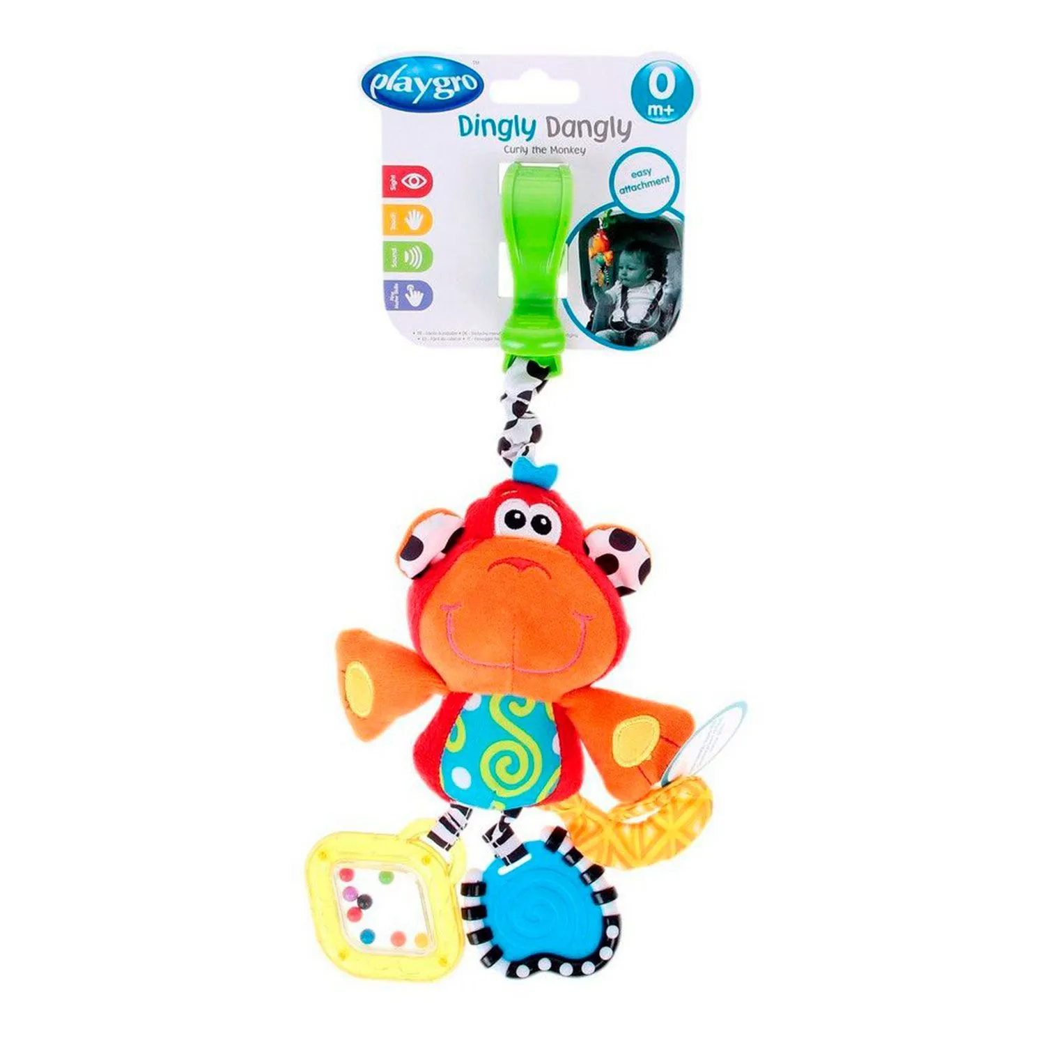 - крепится при помощи зажима, благодаря которому подвеску можно разместить в коляске или кроватке, на дуге развивающего коврика или в автокресле