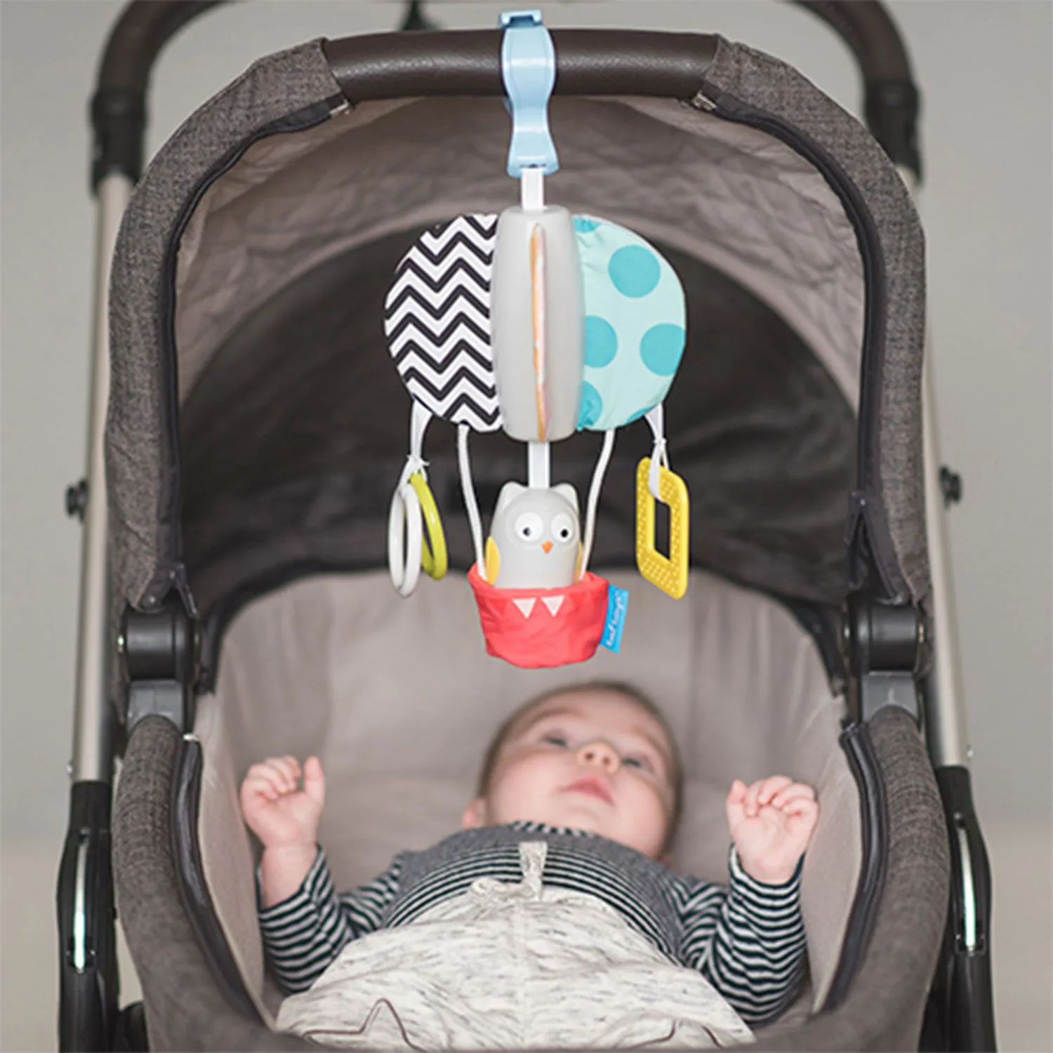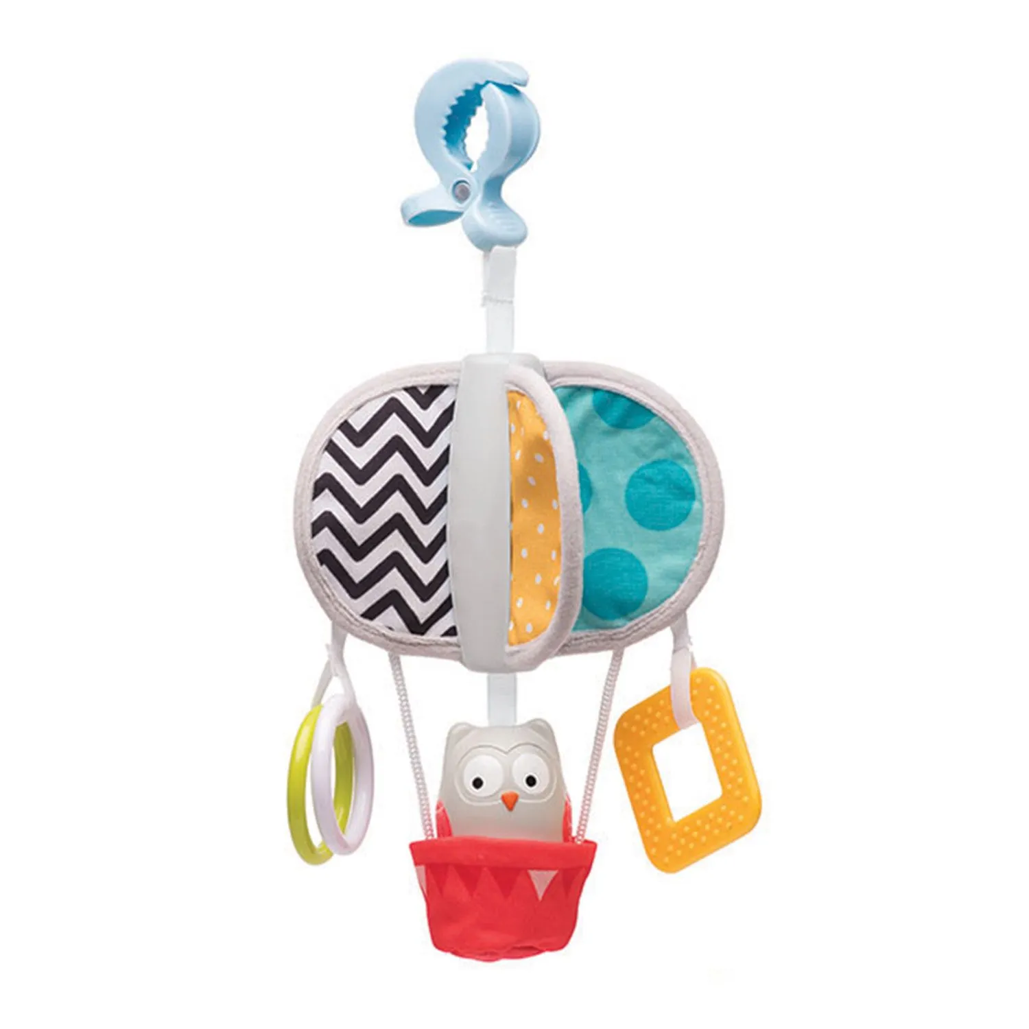 - игрушка крепится к развивающей дуге, коляске или автомобильному креслу с помощью большой клипсы