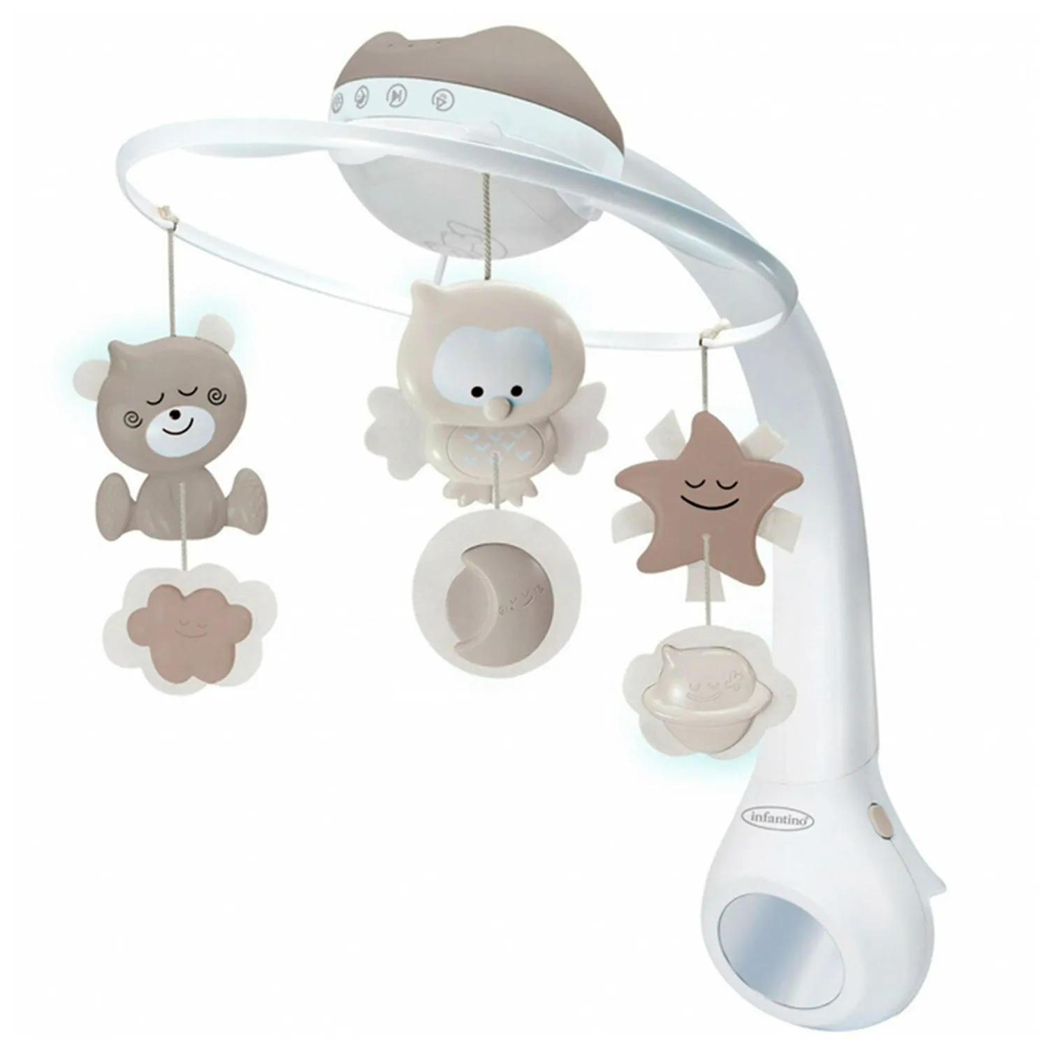 Музыкальный мобиль с красочными подвесными игрушками и звездочкой развлечет и успокоит малыша.