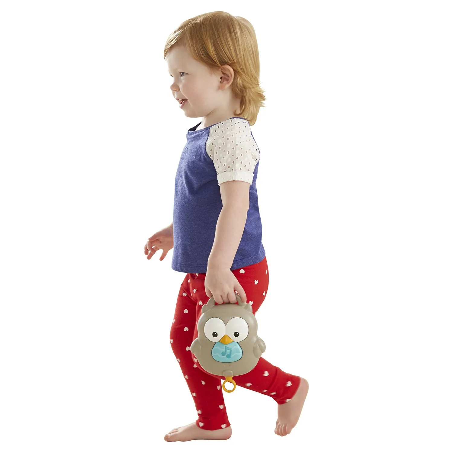 - подвесные игрушки - музыкальная сова, и тканевые яркие игрушечки- лисичка, медвежонок и бобер