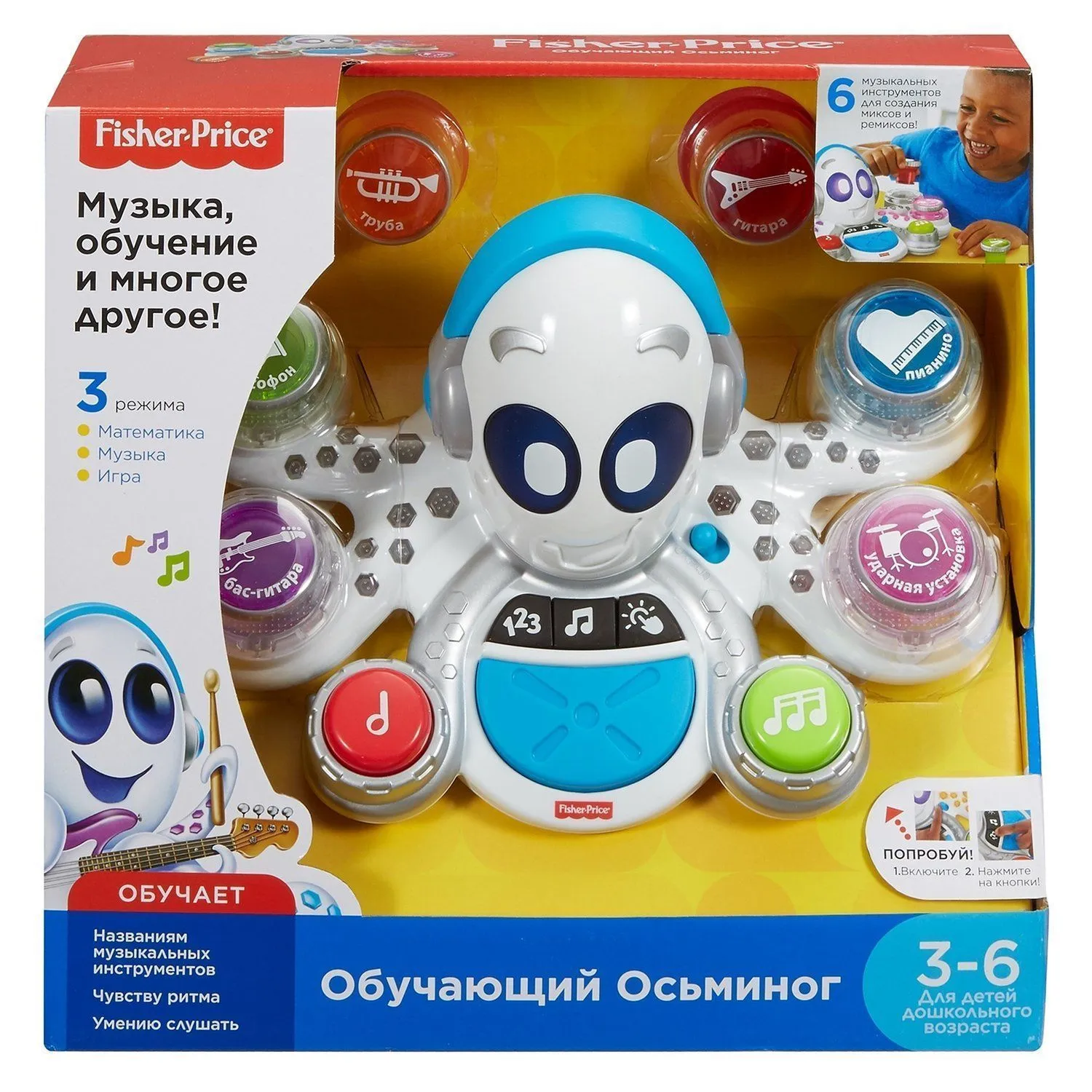 - 6 разноцветных кнопок с музыкальными инструментами (пианино, саксофон, гитара, бас-гитара, ударная установка, труба), которые можно устанавливать в щупальца осьминога