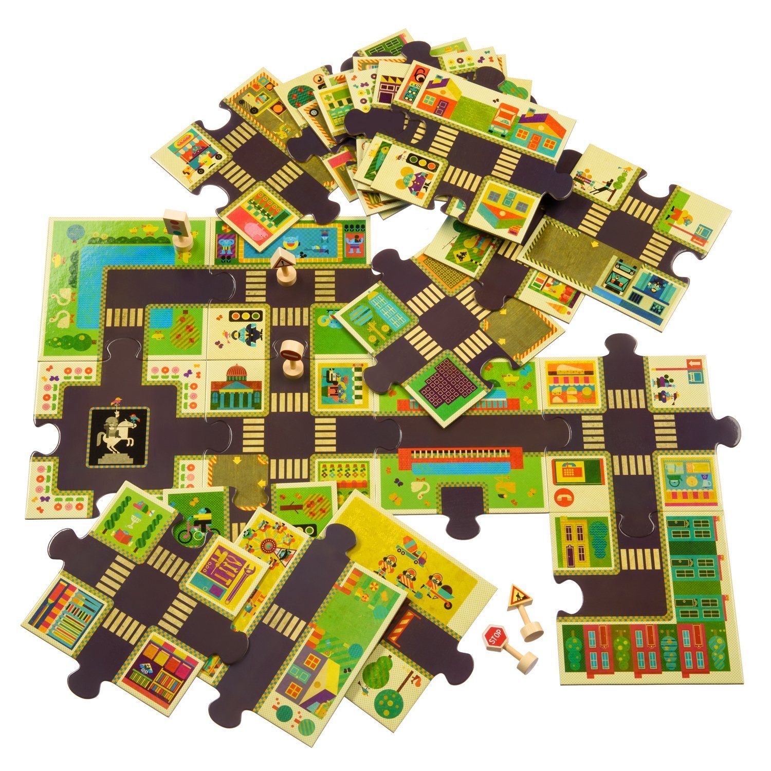 Из многочисленных и достаточно крупных элементов пазла от компании «Djeco» юные автогонщики смогут собрать игровое полотно с изображением автомагистрали.