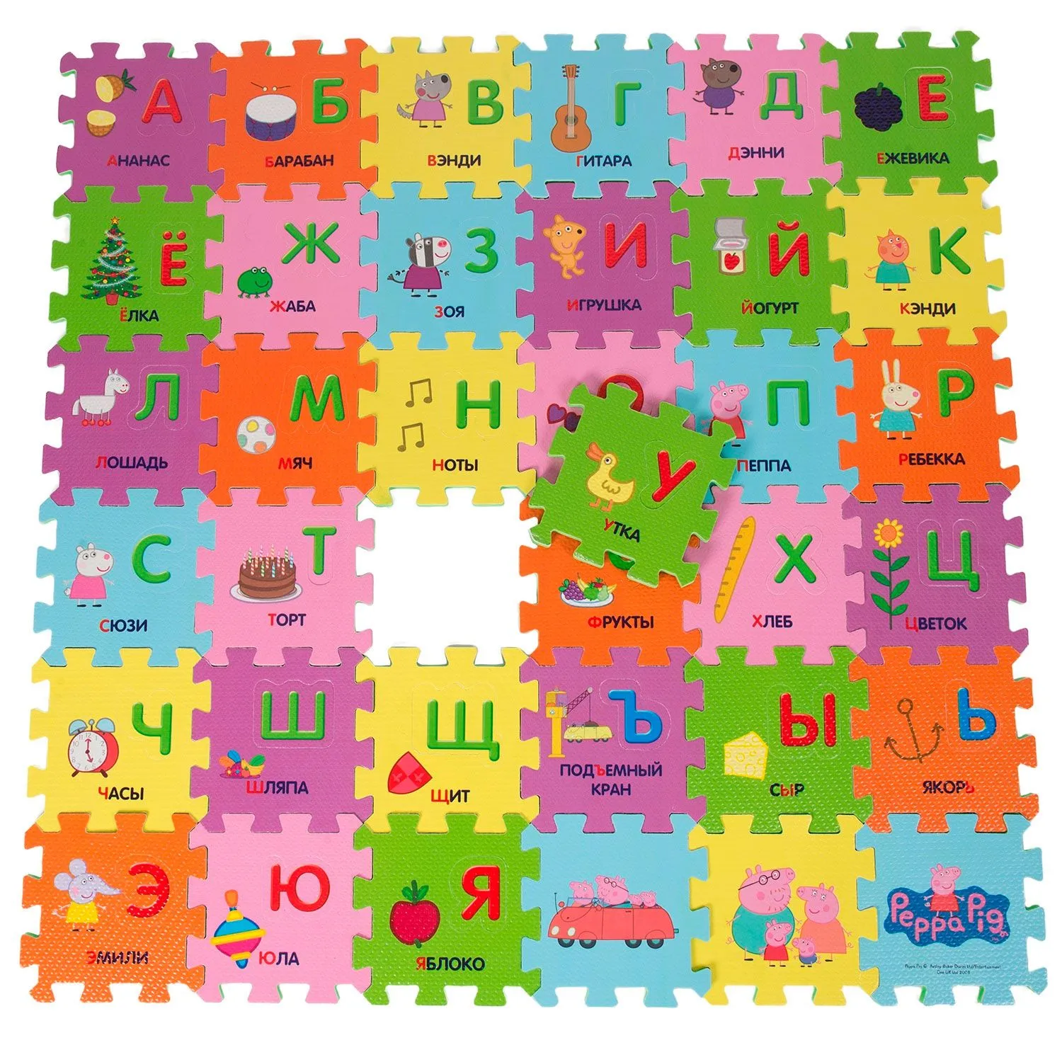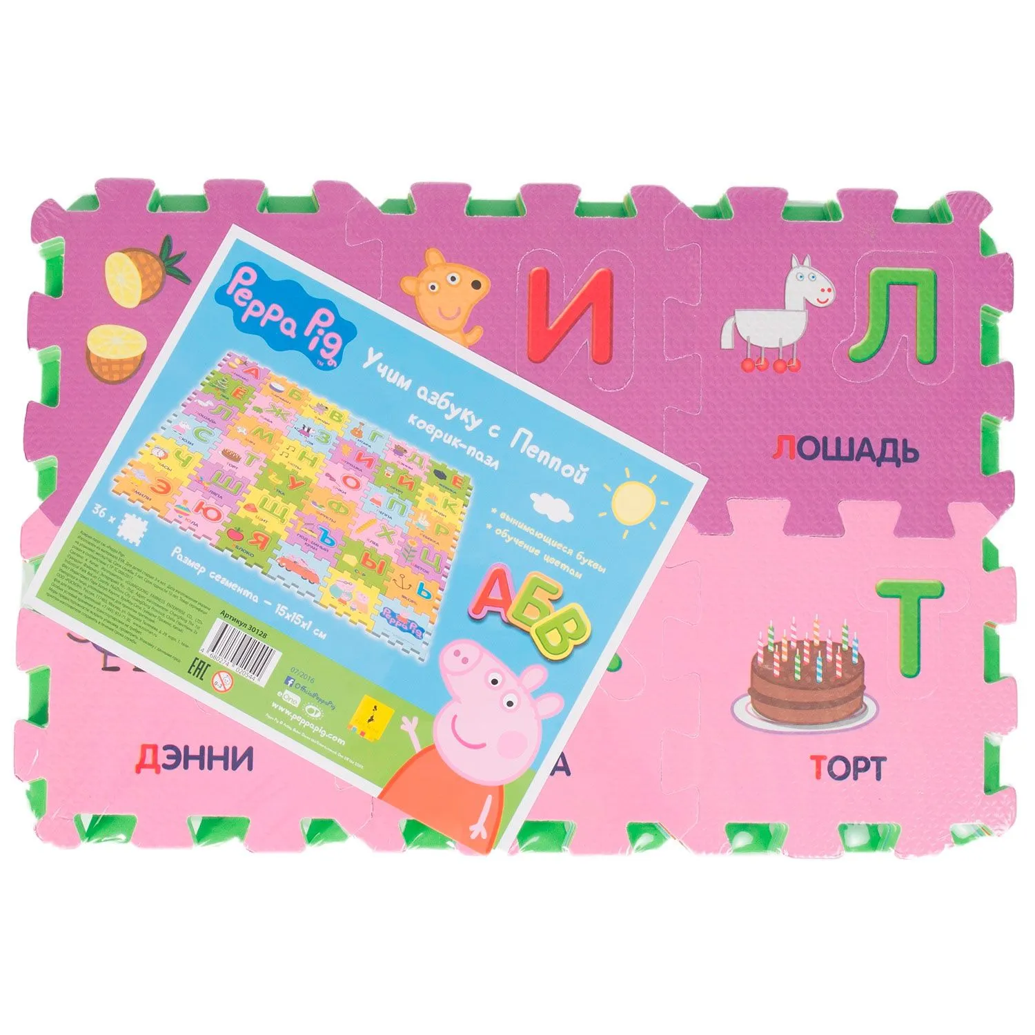 Предложите малышу поиграть с ковриком-пазлом «Учим азбуку с Пеппой», созданным по мотивам мультфильма «Свинка Пеппа».