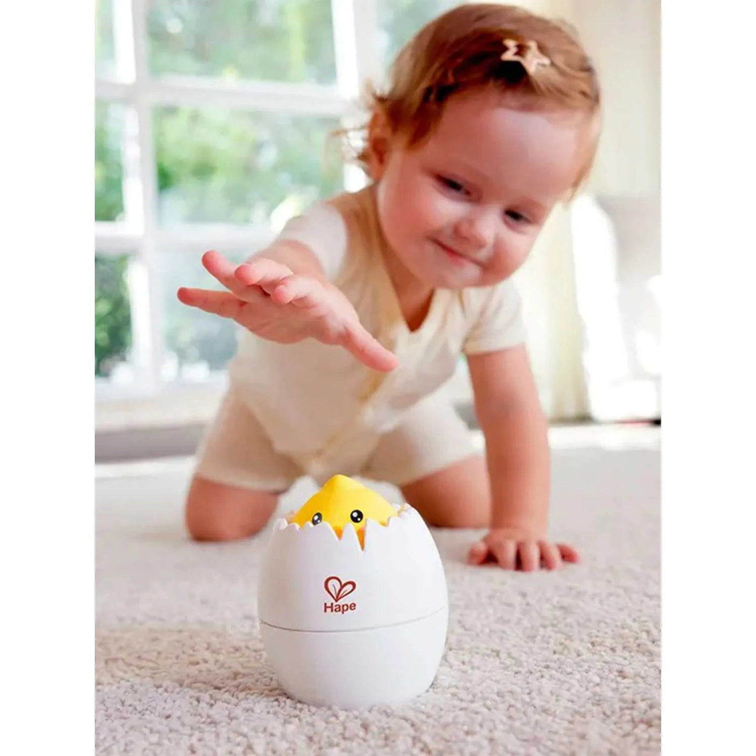 - когда игрушка катится и переворачивается, цыплёнок прячется в скорлупе. Когда яйцо возвращается в изначальное положение - цыплёнок вновь выглядывает из своего укрытия. Завораживающая трансформация развивает у малыша навыки визуального восприятия.