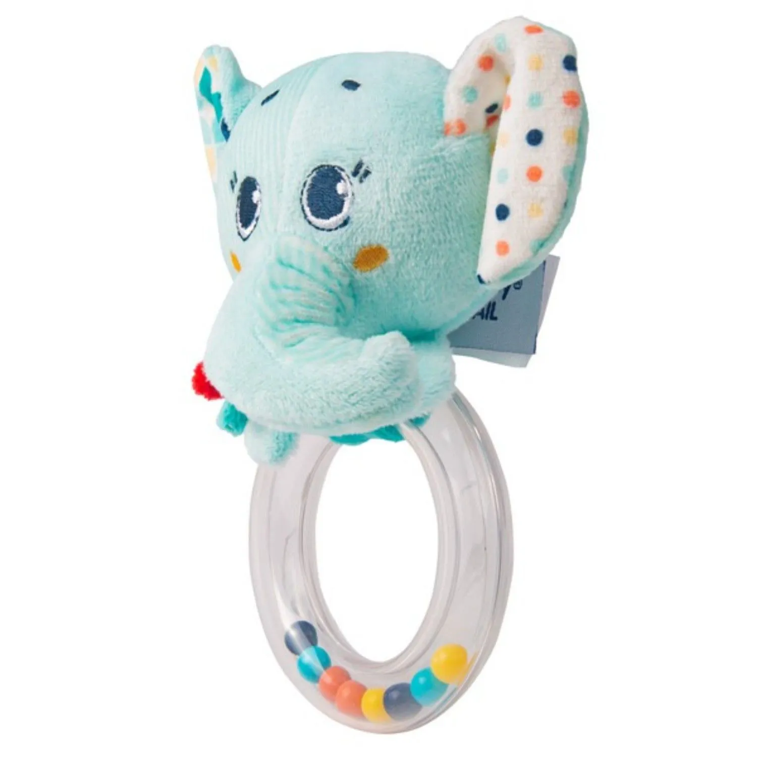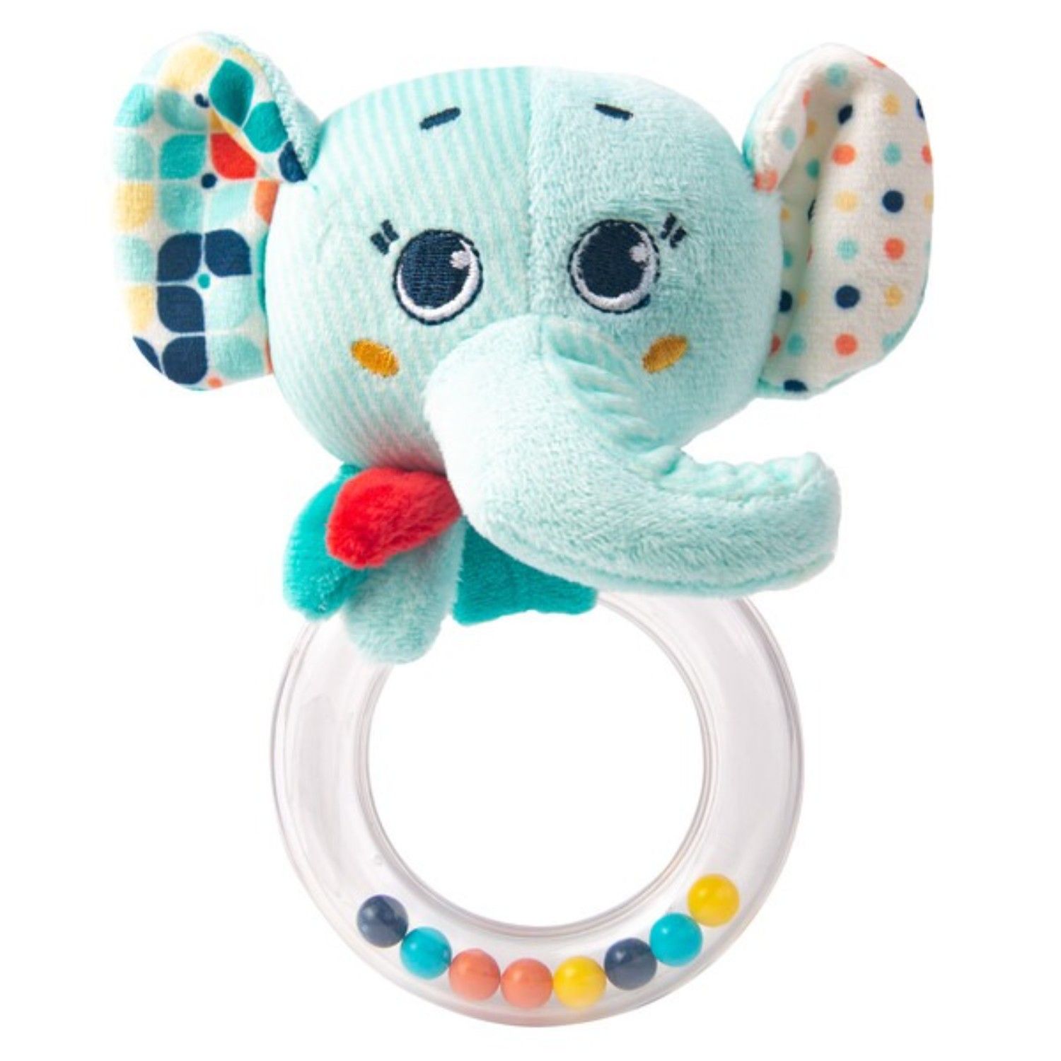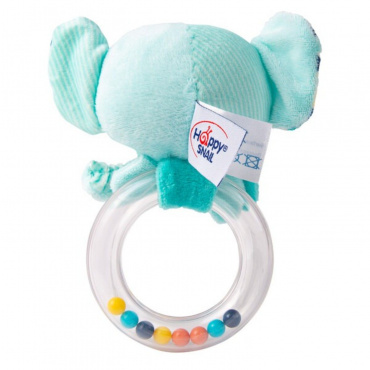 - игрушка 3 в 1: погремушка в виде колечка с бусинами, мягкая игрушка на кольце и пищалка в голове слоника