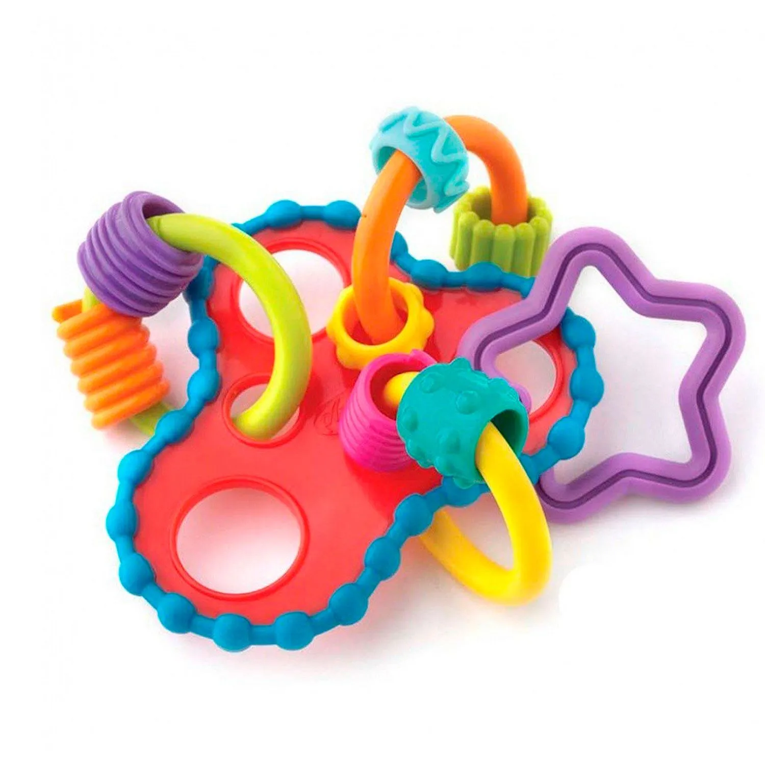 Маленькая, легкая, яркая погремушка похожа на замысловатую головоломку.