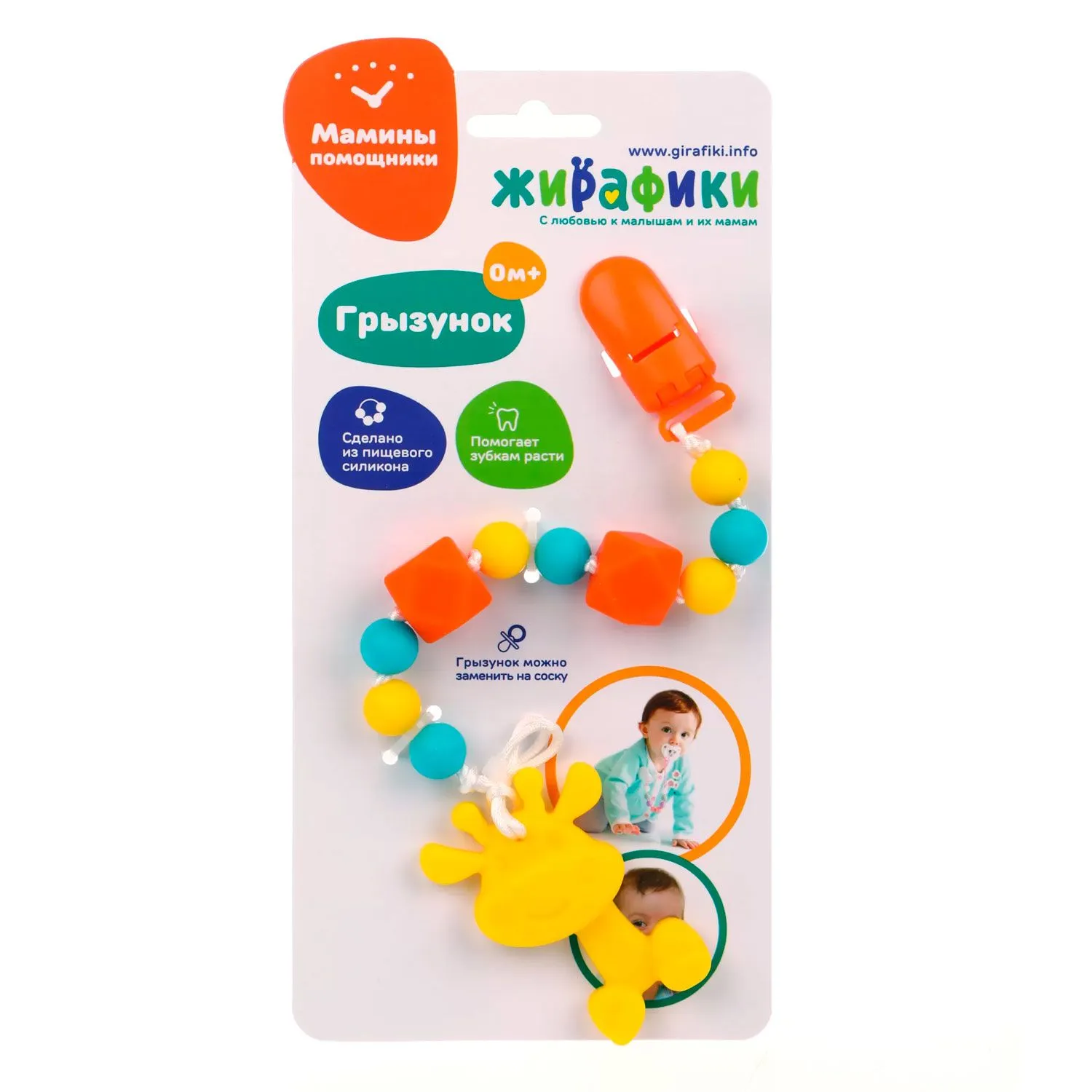 Грызунок сделан из безопасного пищевого силикона, он выполняет роль прорезывателя для зубов.