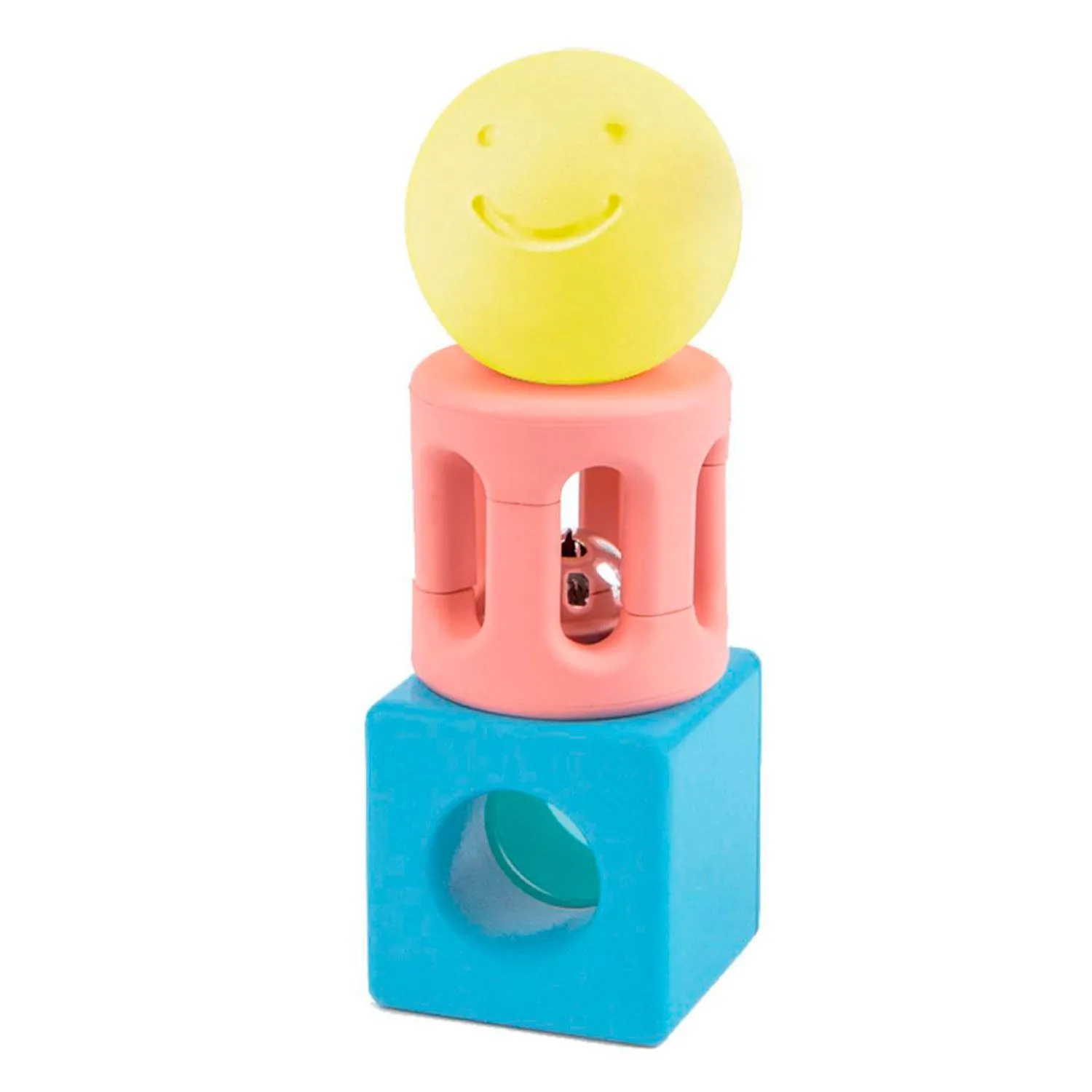 - геометрическое трио погремушек включает в себя один круглый желтый мяч, который содержит деревянную бусину, цилиндрическую игрушку с колокольчиком и кубик