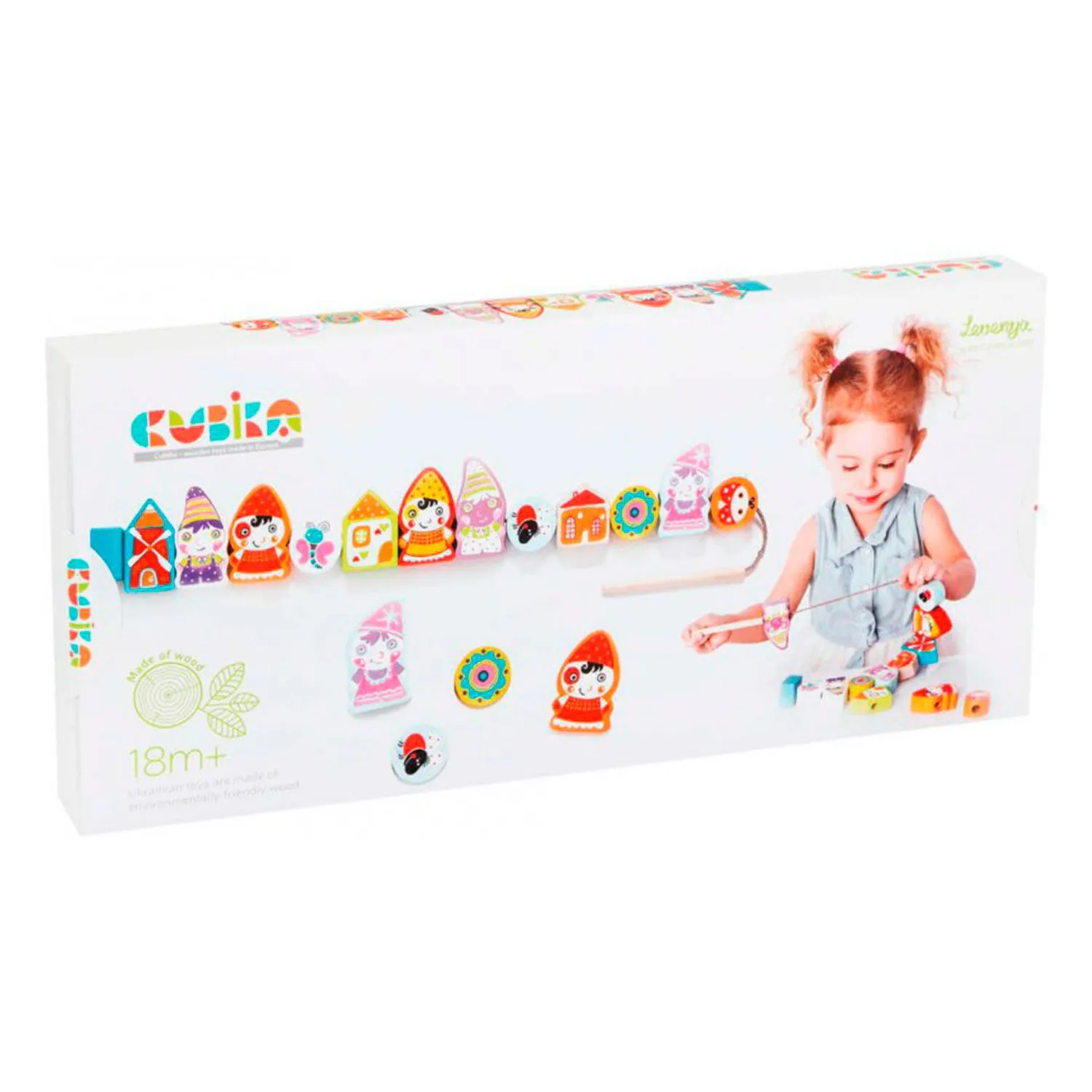 - набор состоит из веревочки-основания и 12 деревянных элементов, которые ребенку необходимо нанизывать на шнурок