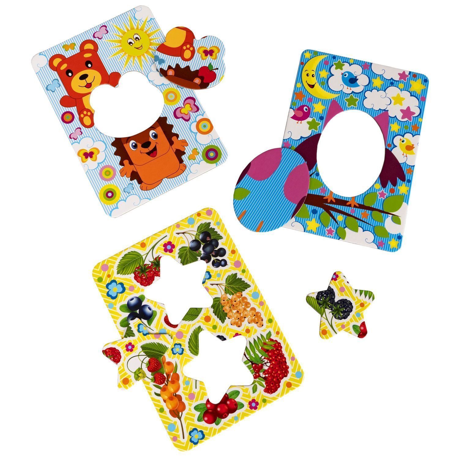 - задания включают подбор недостающих фрагментов по цвету, форме и изображению