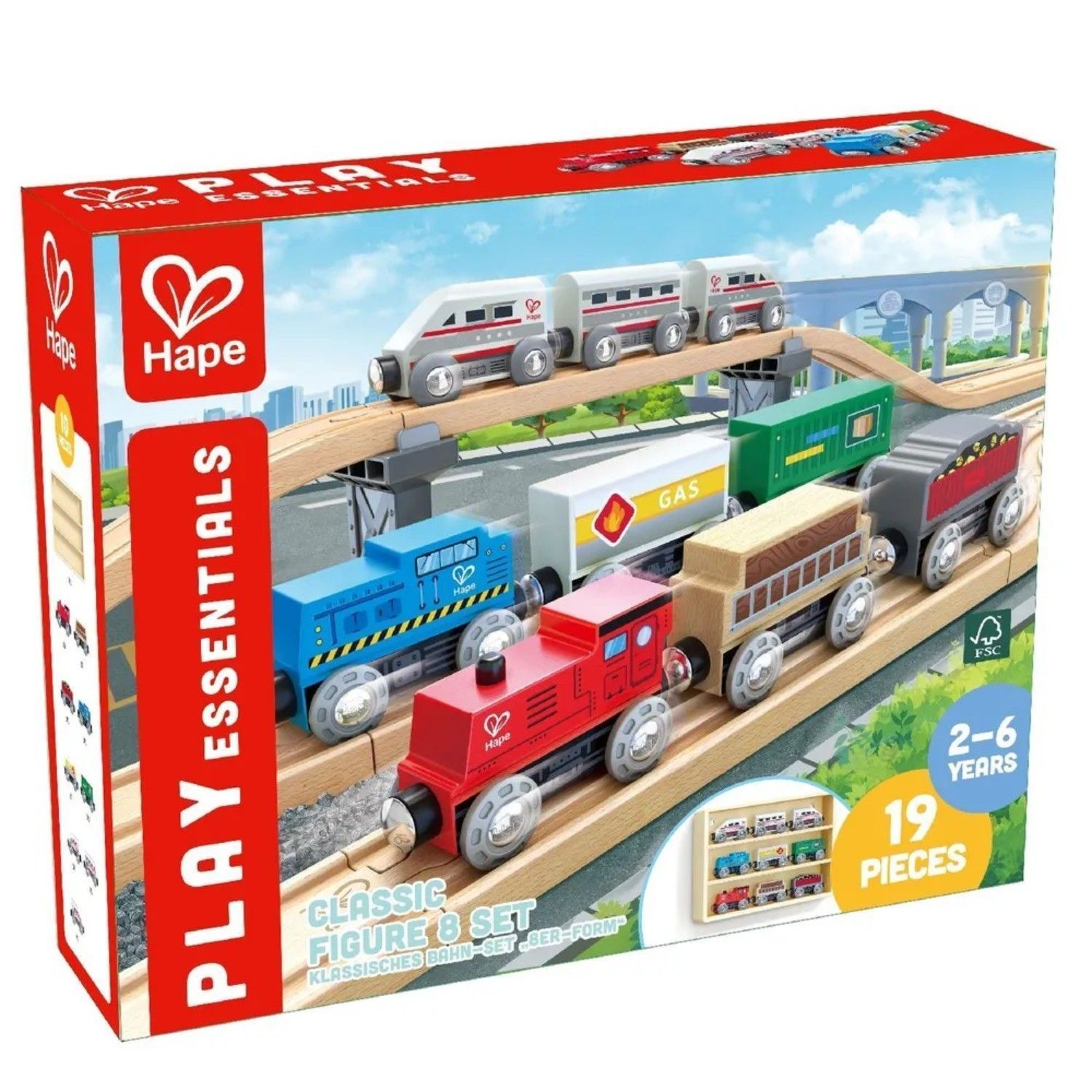 Набор поездов с системой для хранения от бренда Hape прекрасно дополнит коллекцию деревянных железнодорожных поездов и расширит возможности творческой игры.