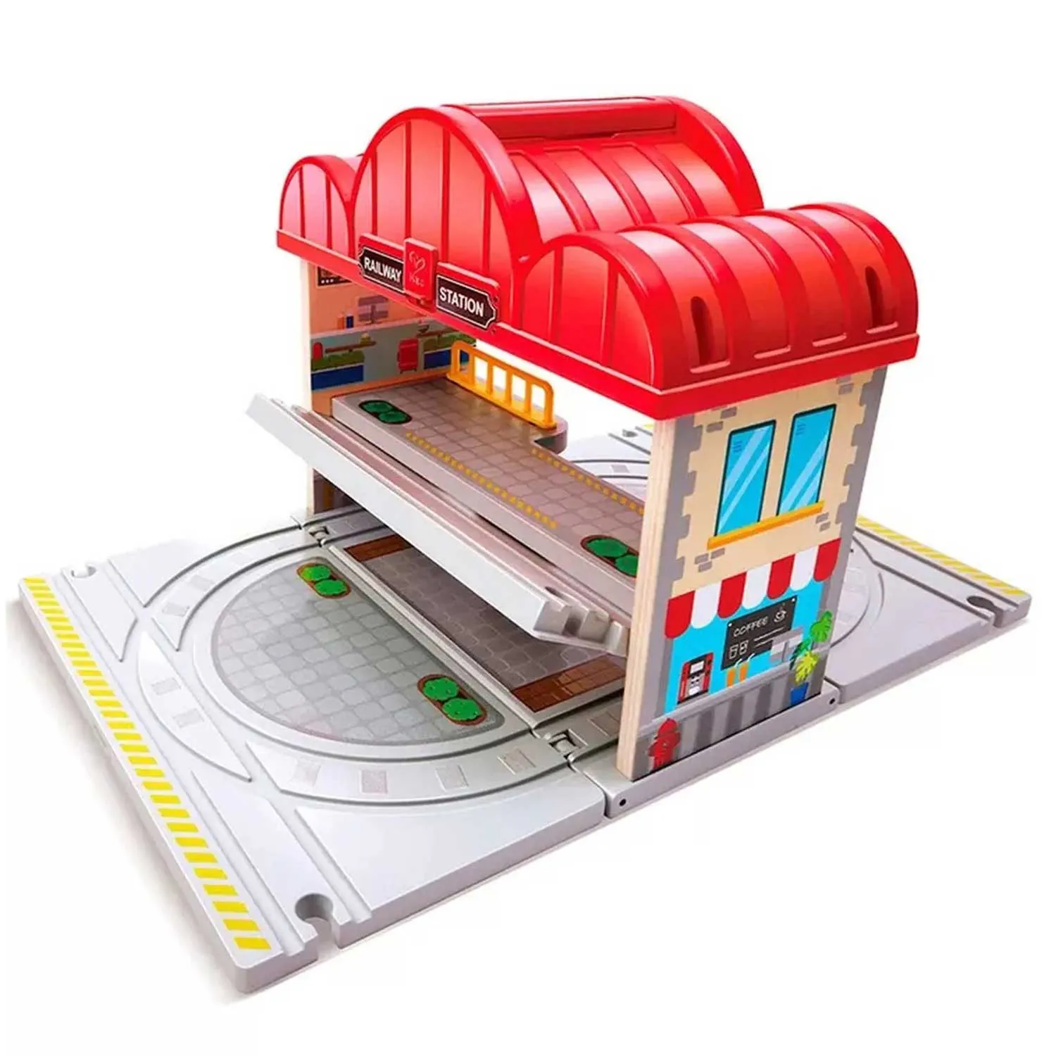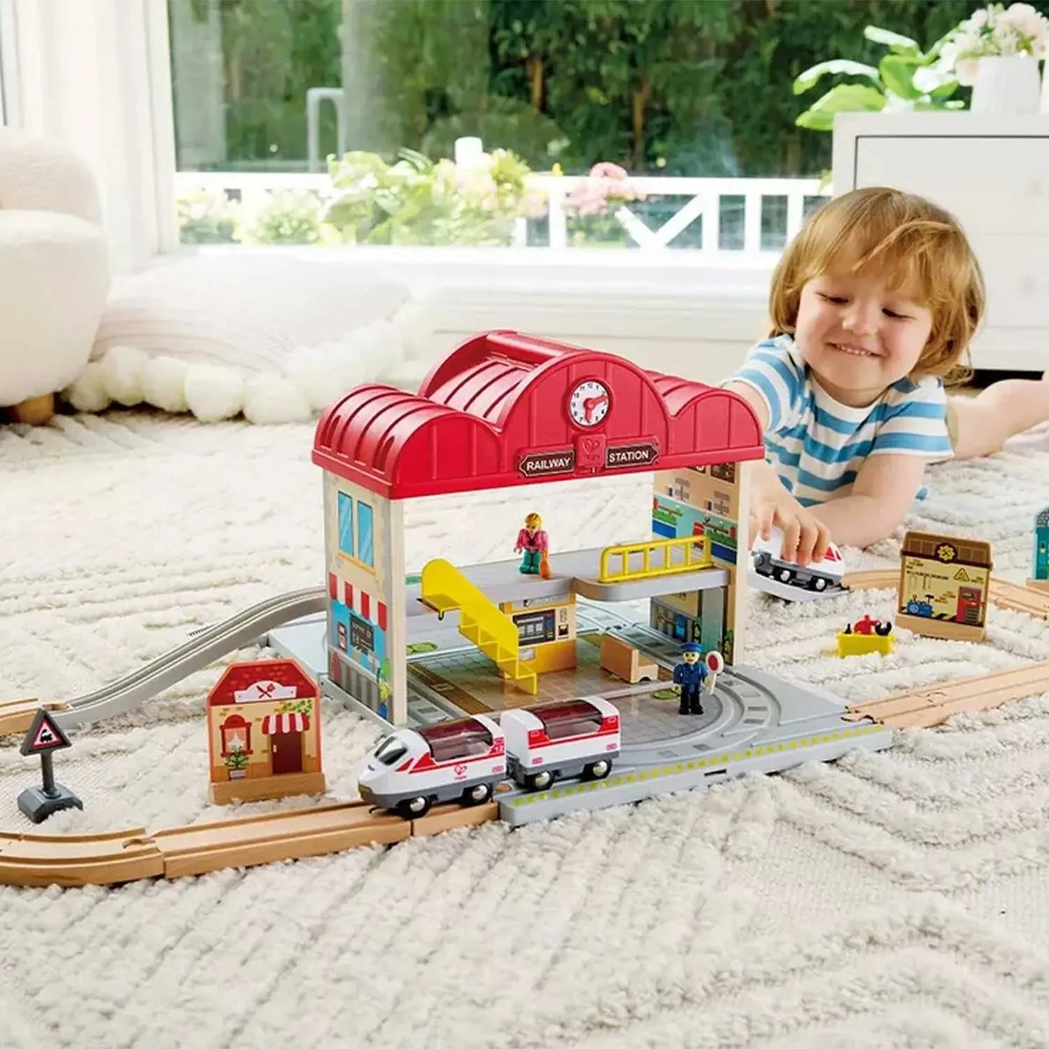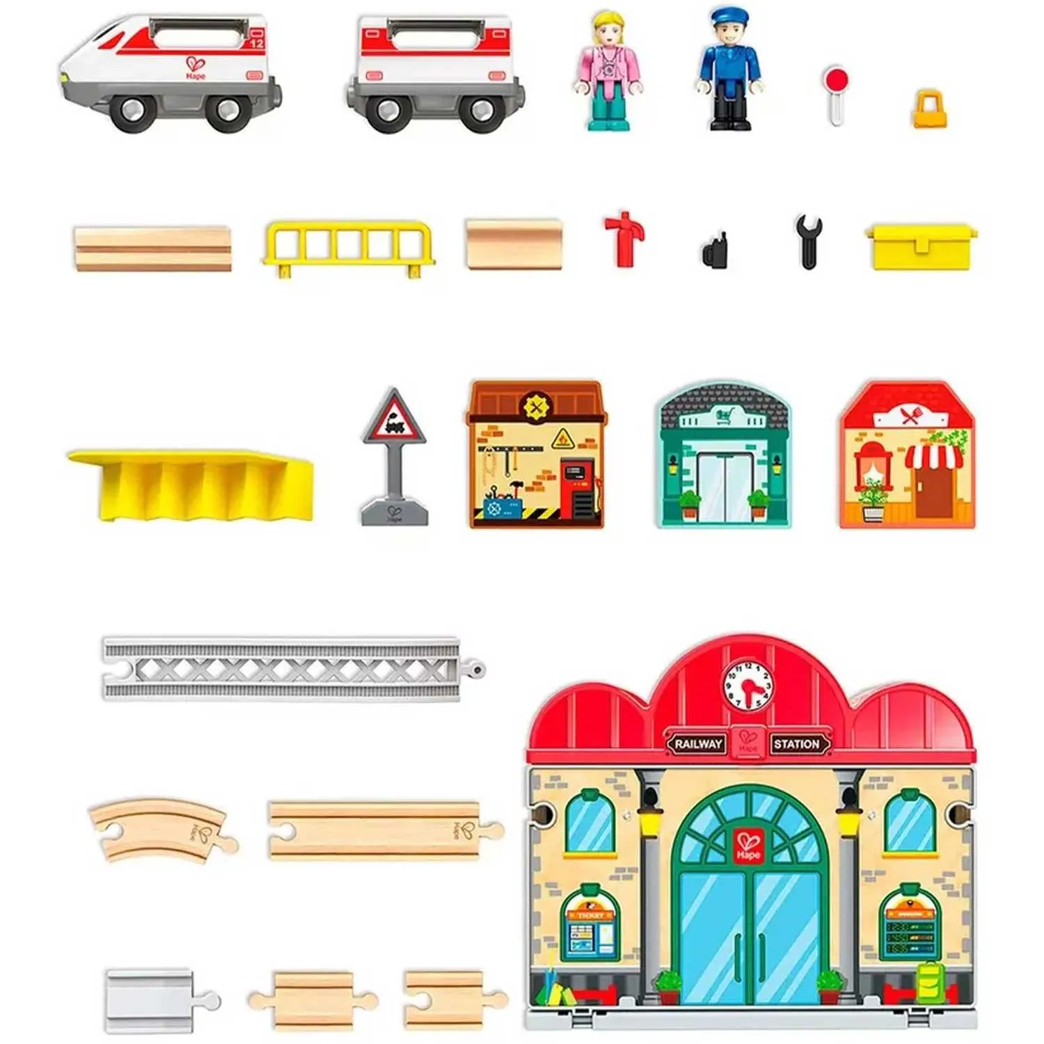 - набор включает миниатюрную железнодорожную станцию с фигурками пассажира и сотрудника, позволяющими разыгрывать разнообразные сценарии. Ребёнок сможет придумывать собственные истории вокруг станции: перевозка ценных грузов, утренняя суета с пассажирами, спешащими на поезд, или даже форс-мажорные обстоятельства, такие как устранение неполадок
