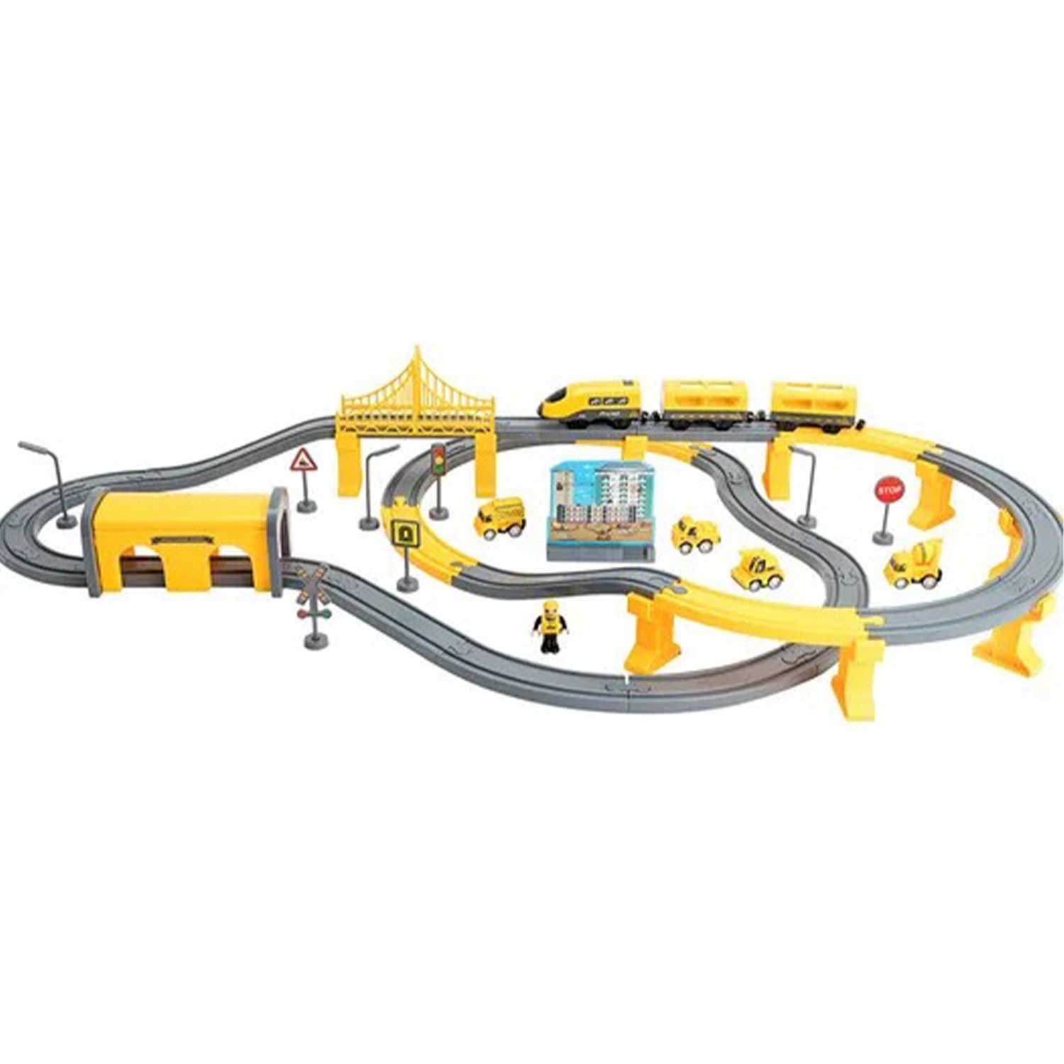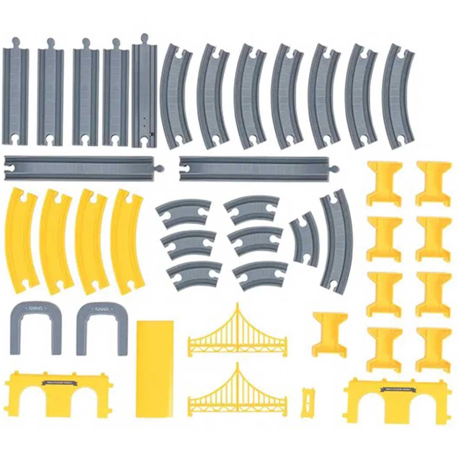 - крупный набор: 92 элемента позволяют собрать разнообразные конструкции — мосты, тоннели, строительную площадку