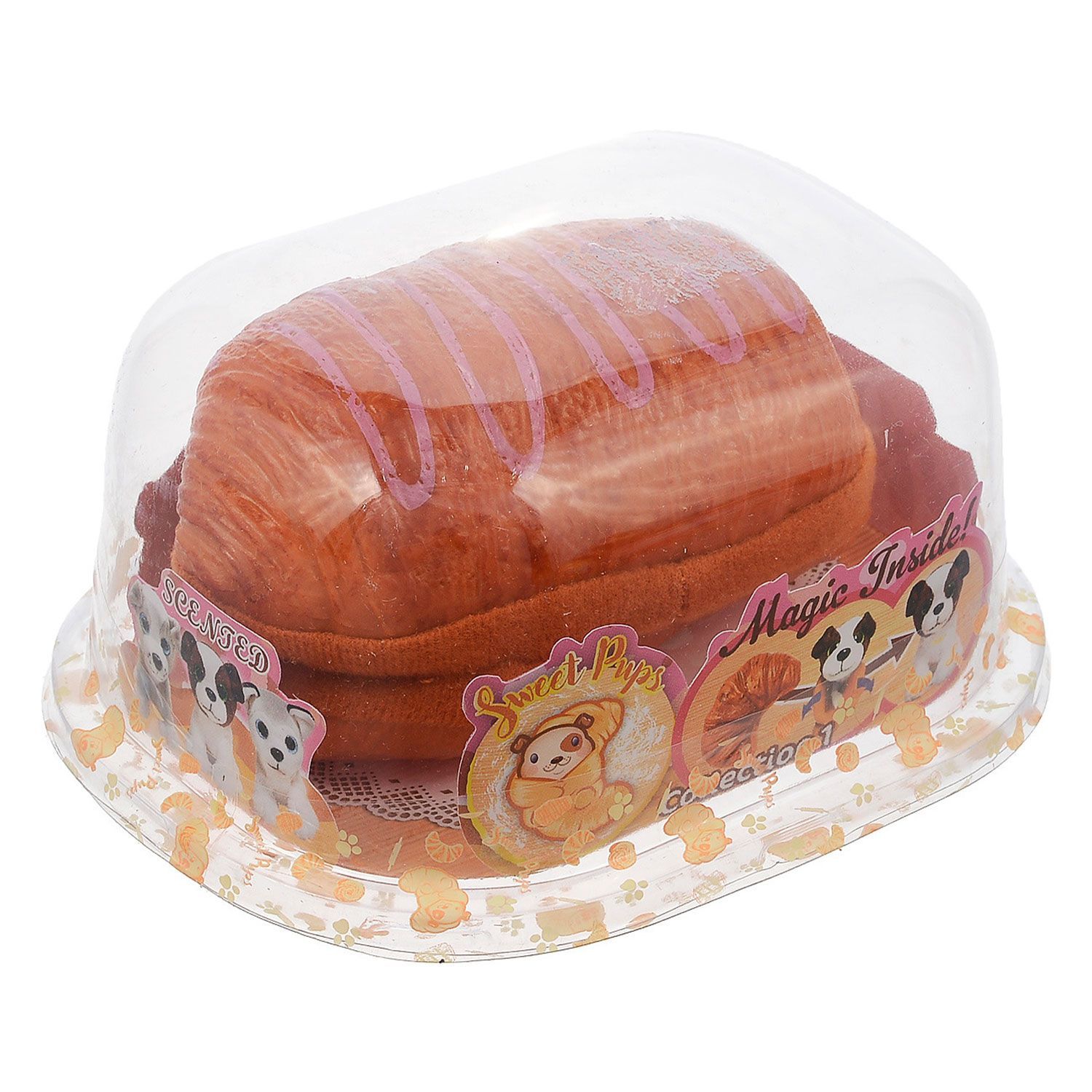 - игрушка может показаться обычной выпечкой в виде булочки, круассана или рулетика, но стоит вывернуть его наружу, как он превращается в забавного мягкого щенка