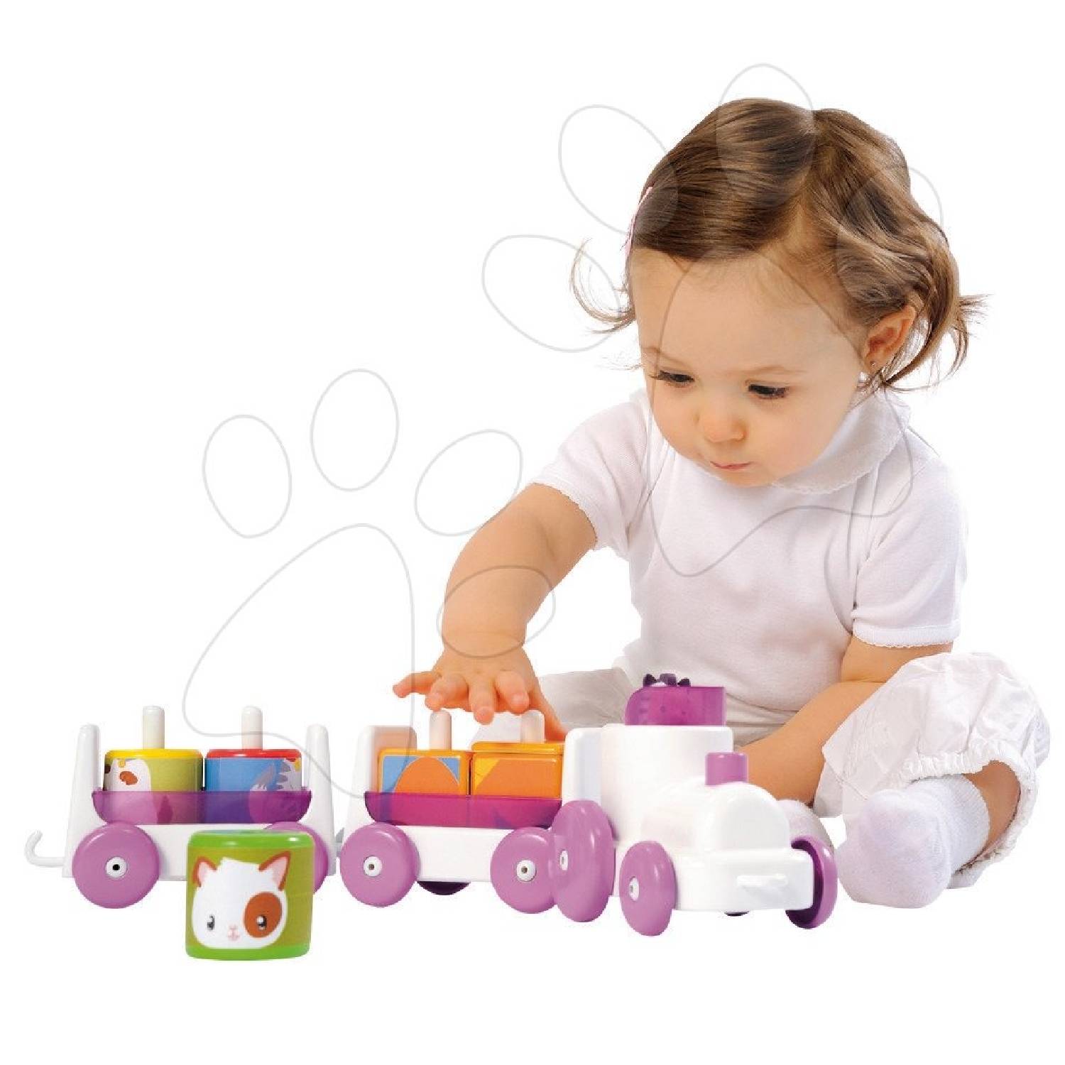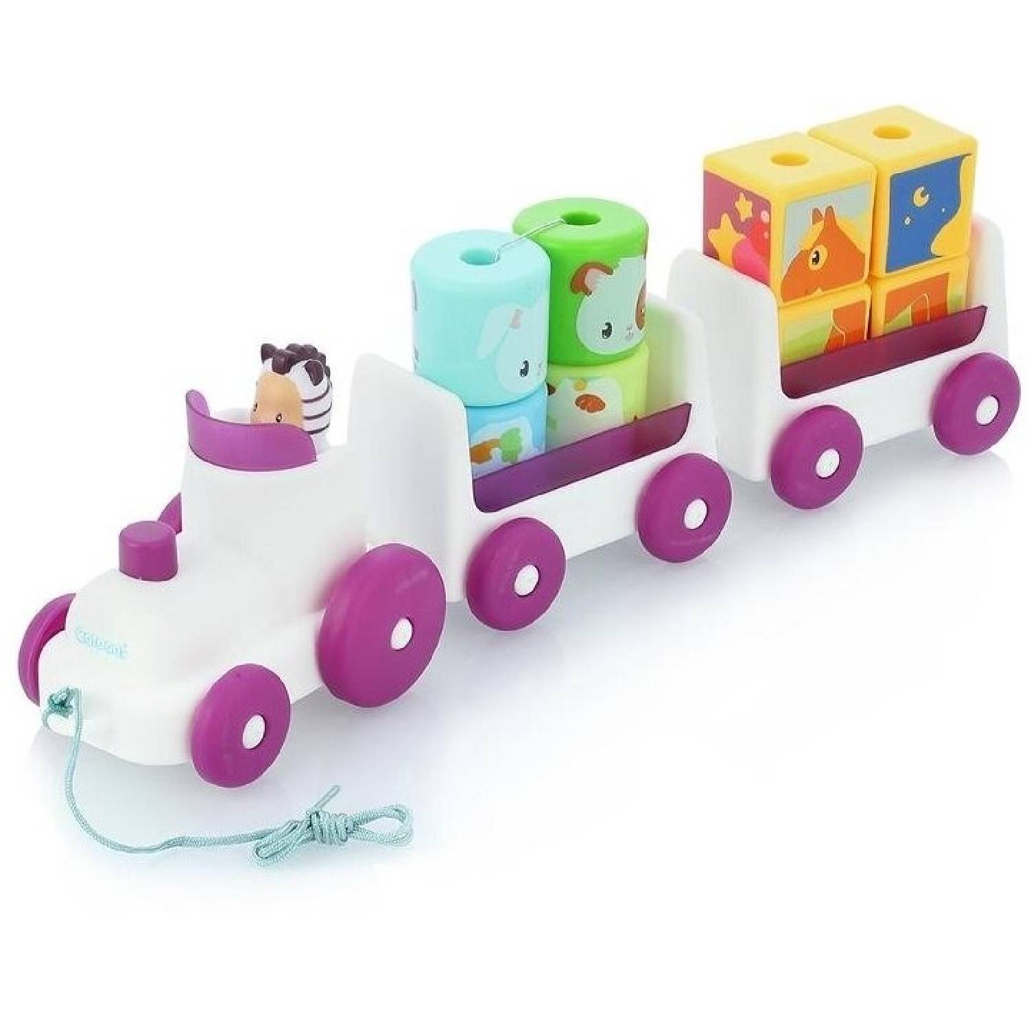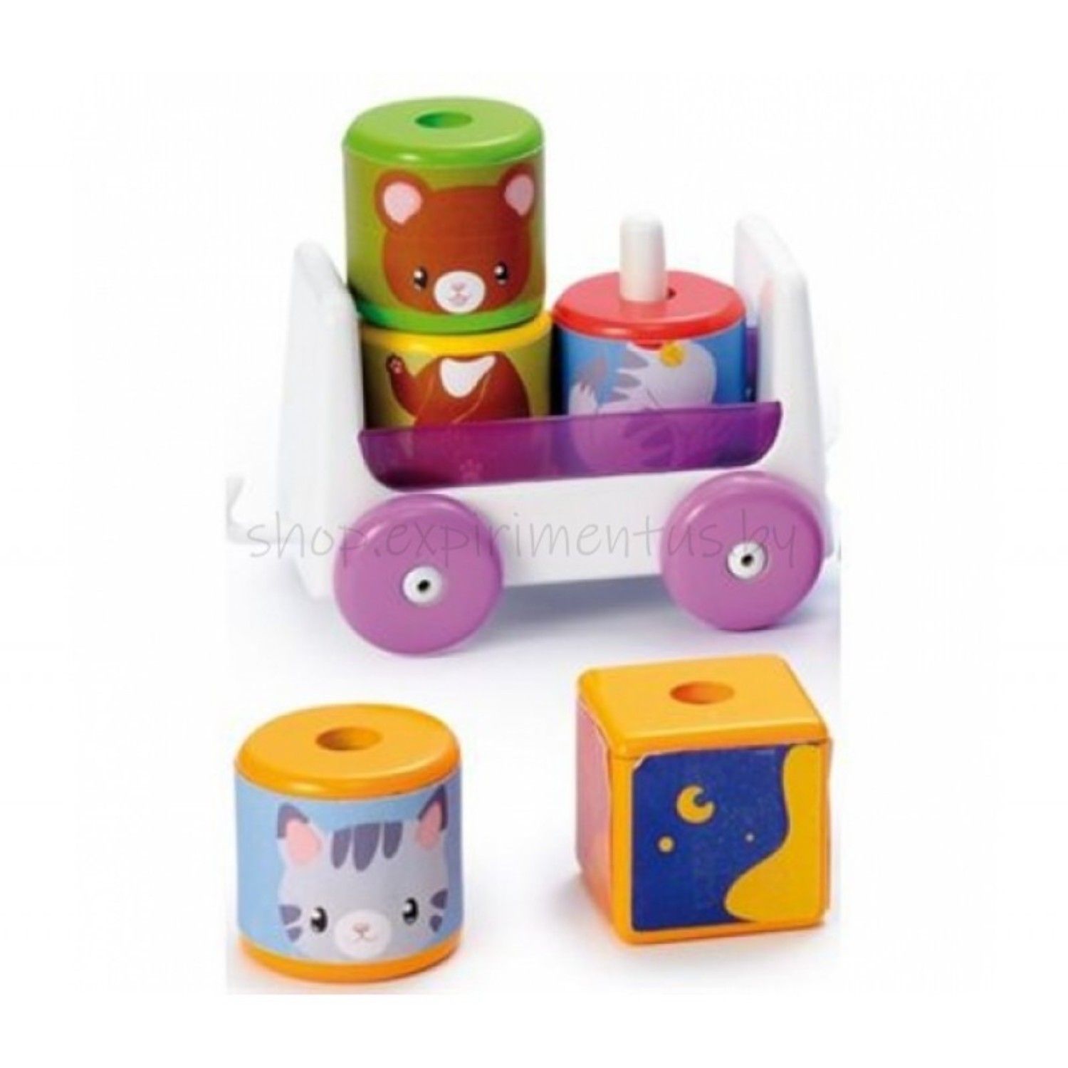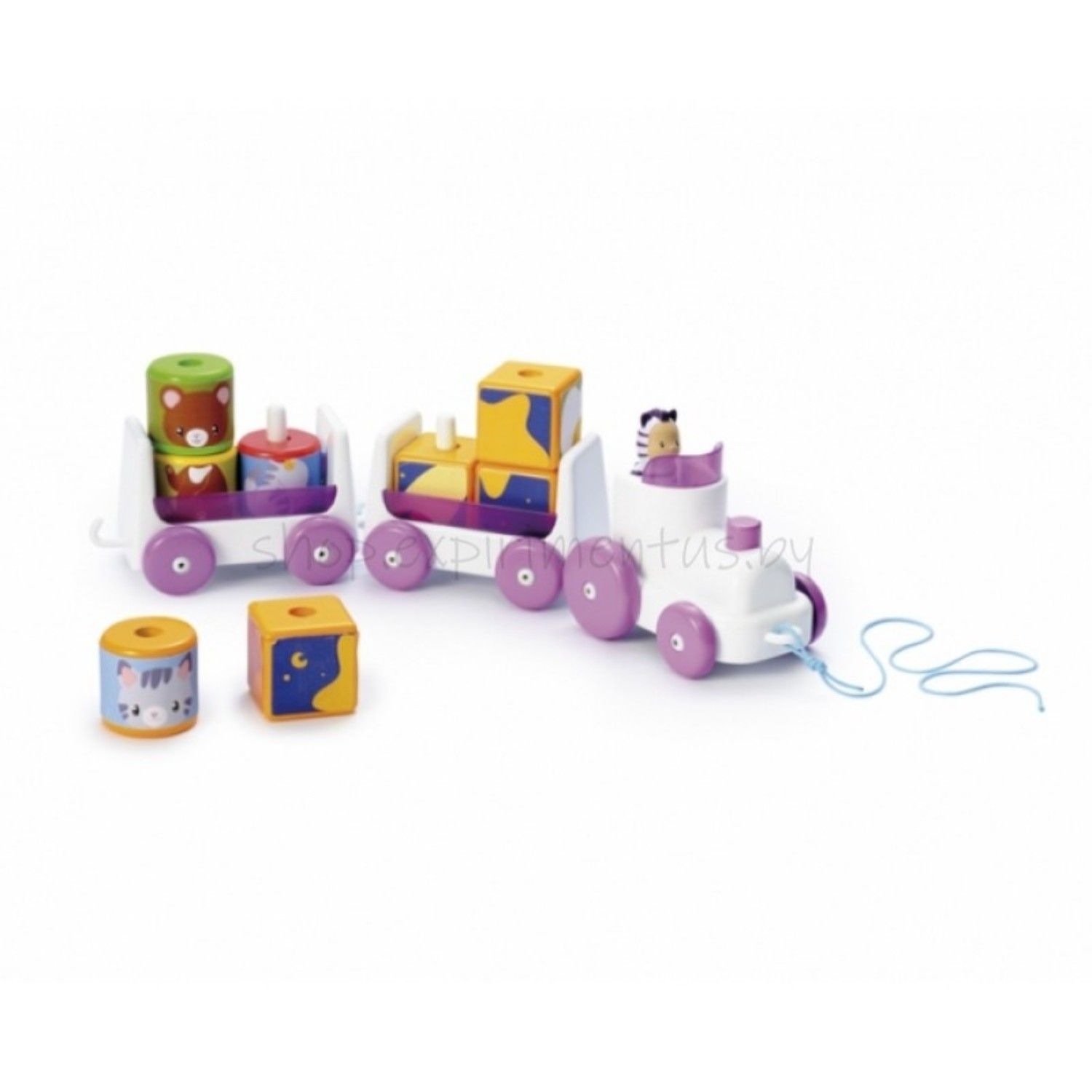 - вагончики представляют собой основание со штырьками, на которые одеваются кубики с изображёнными зверушками на гранях