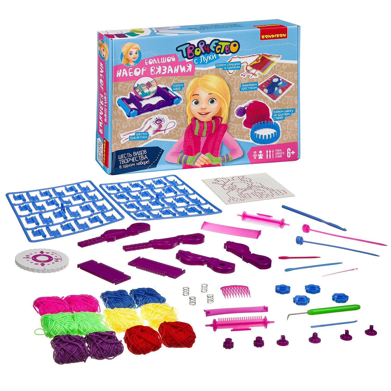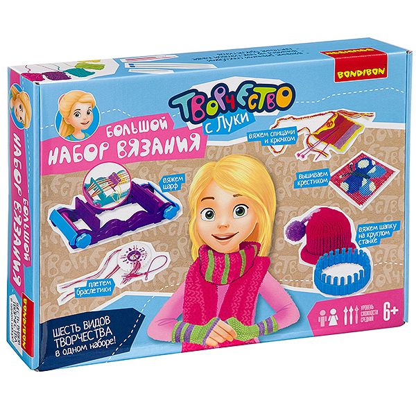 Большой набор вязания - это мечта для маленькой рукодельницы! Благодаря ему можно изучить все основные виды вязания - крючком, спицами и на специальных станках вышиваем чудесную бабочку на пластиковой канве, плетем браслетики - и все это в одном наборе от BONDIBON!