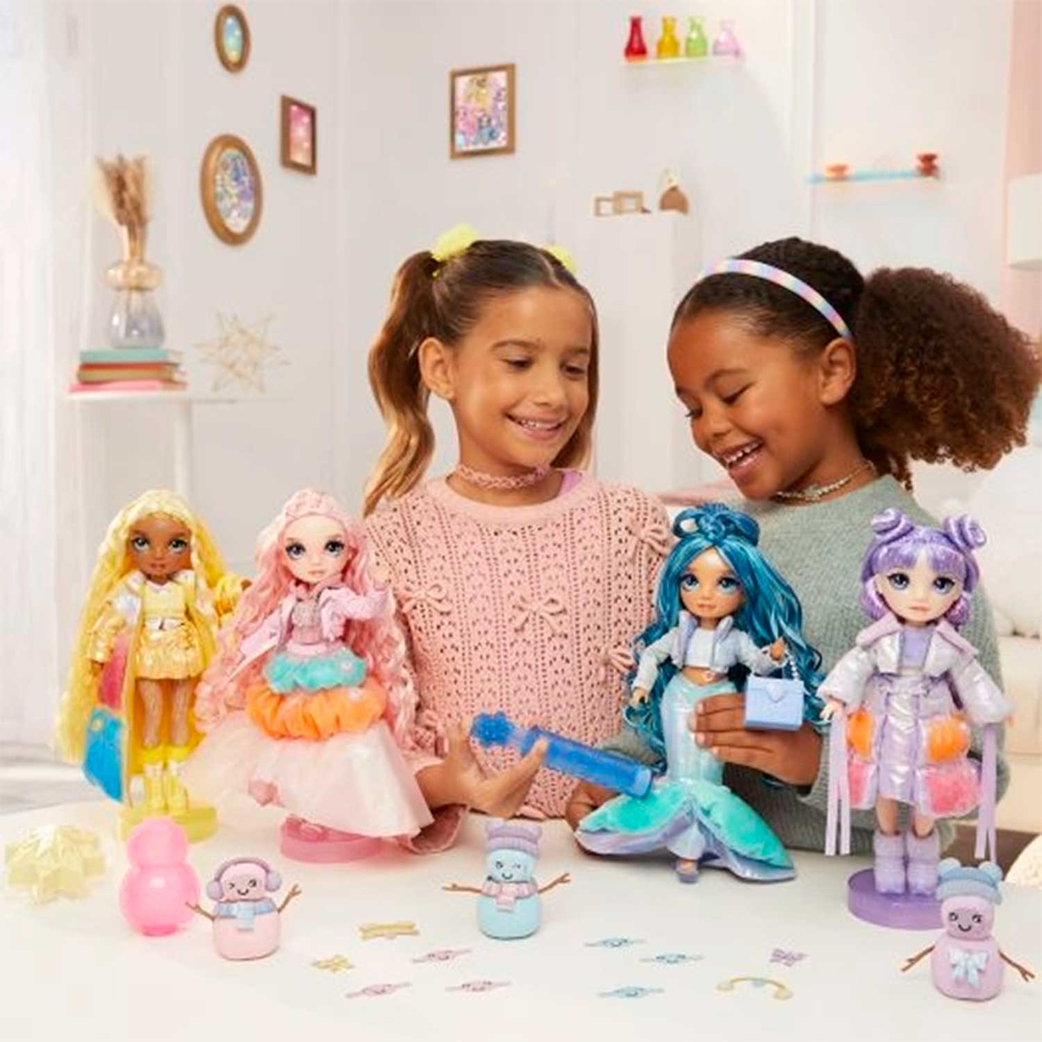 - соберите всех кукол Rainbow High Winter Wonderland: Белла (розовая), Санни (желтая), Виолетта (фиолетовая) и Скайлер (синяя)!