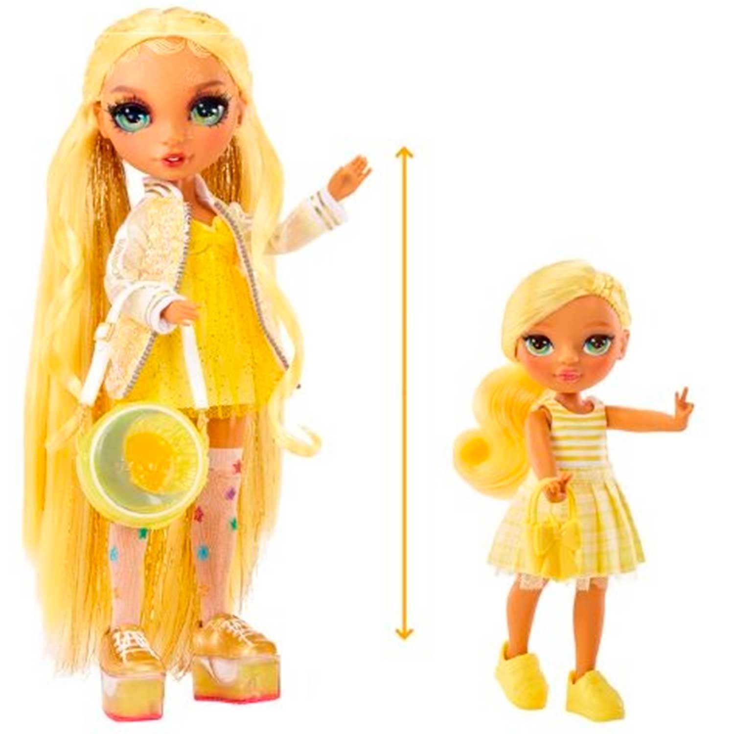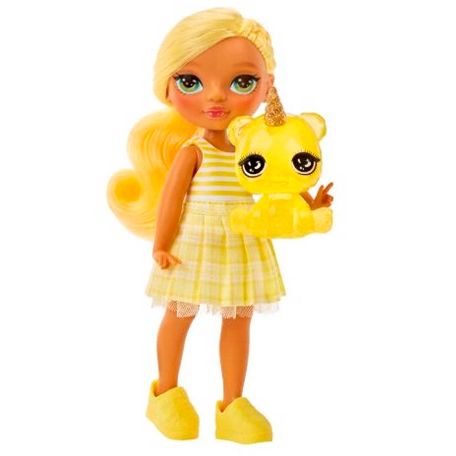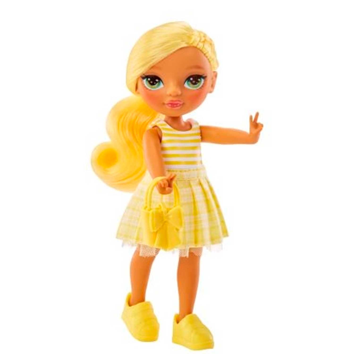 - кукла Дэйзи одета в желтое платье с мягкой клетчатой юбкой и формованным полосатым топом