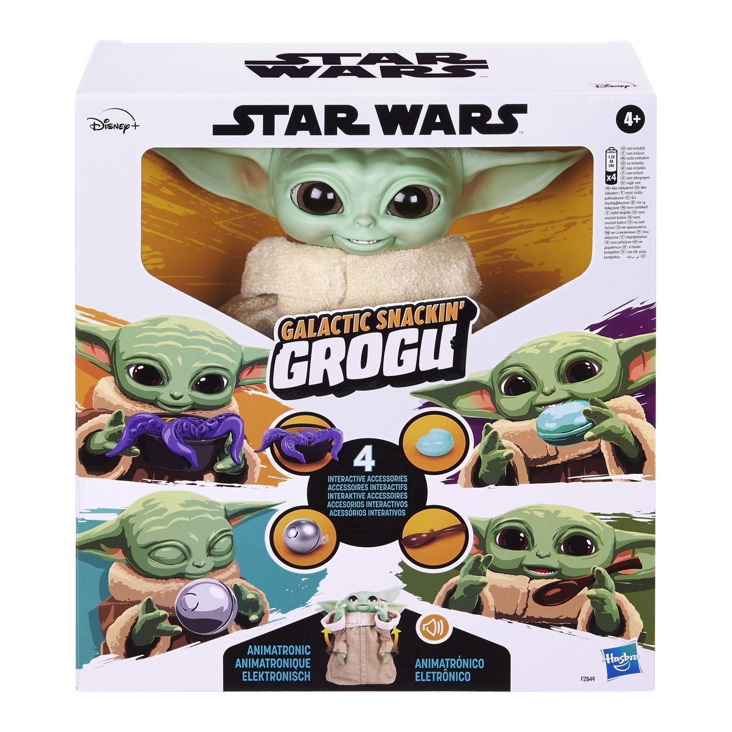 - аниматронная игрушка “Поедатель галактических снеков Грогу” поставляется с 4 интерактивными аксессуарам (миской с щупальцами, печеньем, переключателем и ложкой), положите их в руку Малыша, и он отреагирует движениями и звуковыми эффектами