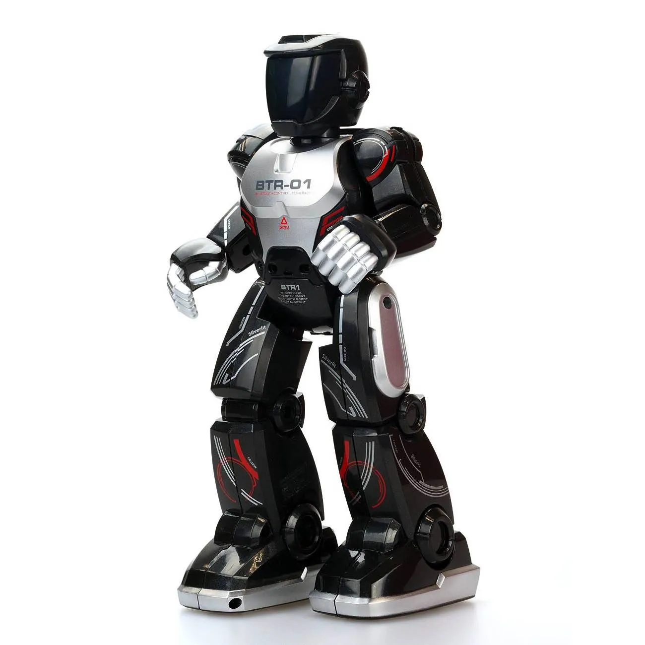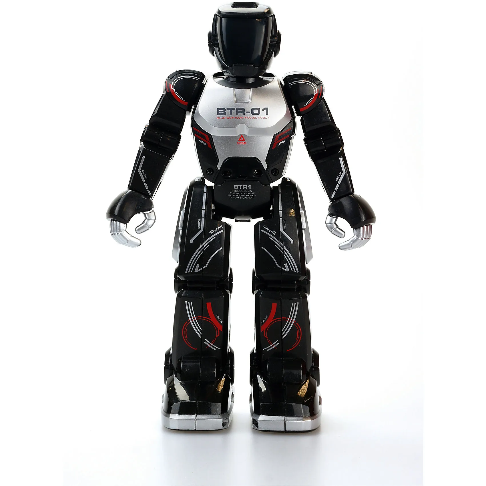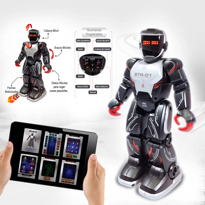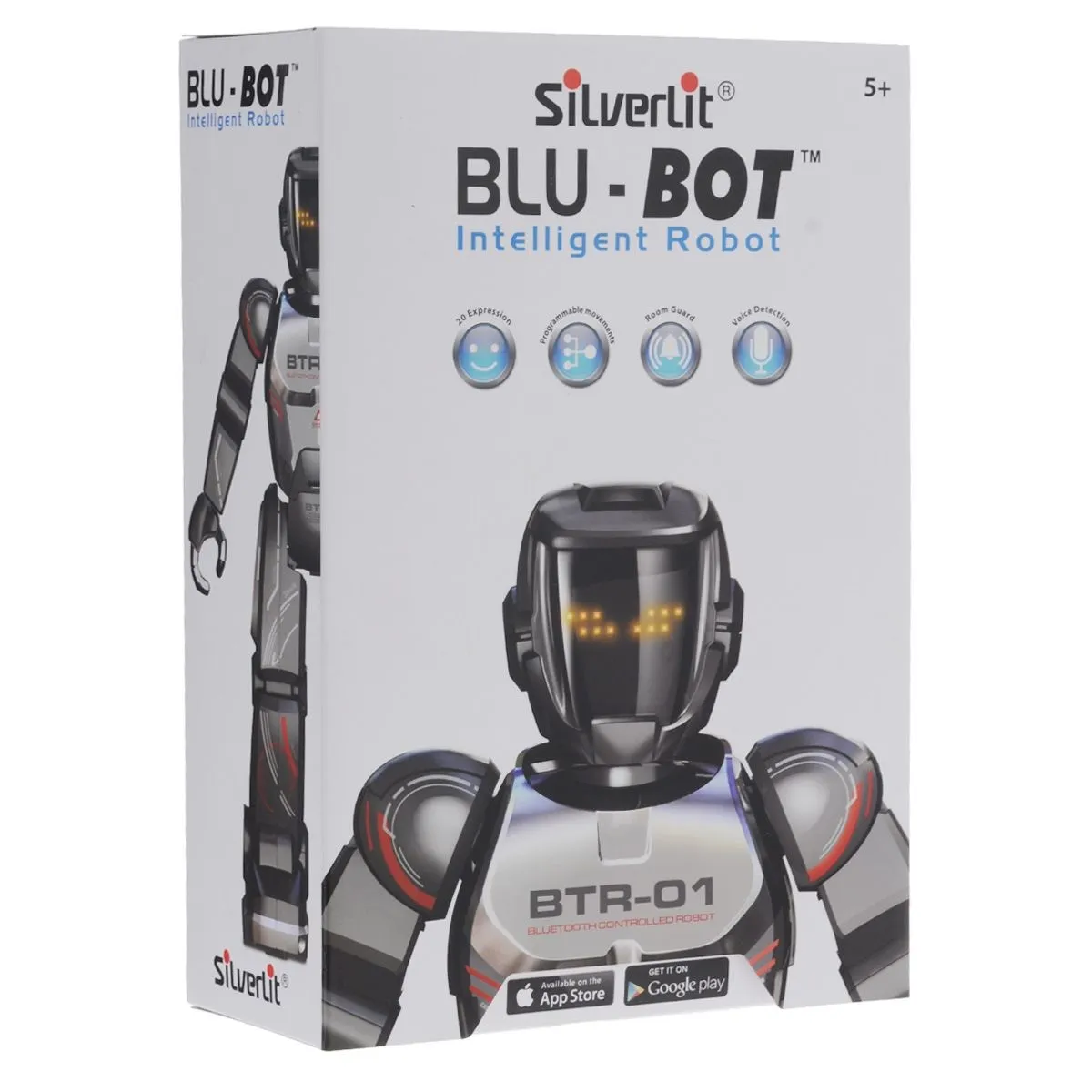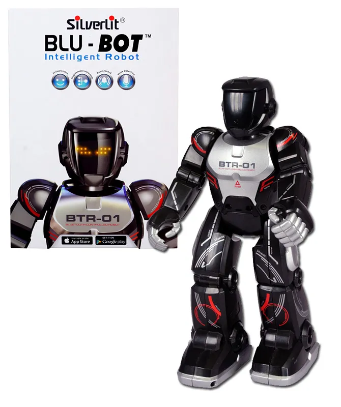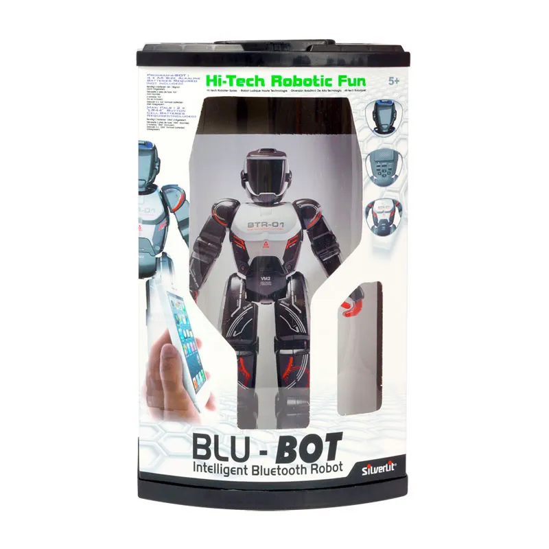 Программируемый робот Blu-Bot черно-стального цвета производит впечатление своим внешним видом и функционалом, заложенным в него производителем - компанией Silverlit. Умная игрушка управляется кнопками на корпусе или через Bluetooth-соединение специальной программой для смартфонов и планшетов (IOS и Android).