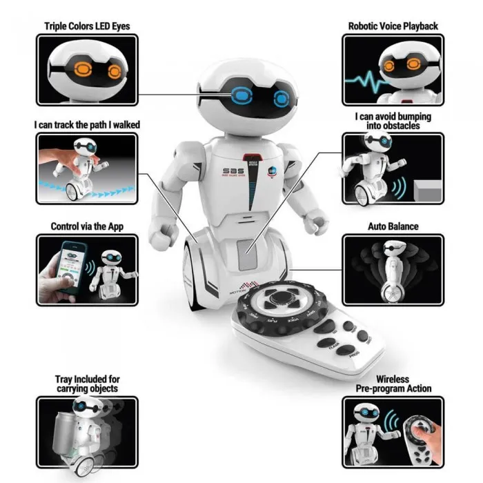 Эта модель белого цвета обладает более 15 различными функциями, такими как авто баланс, запись и воспроизведение голоса, запоминание маршрута, избегание препятствий и другие. Еще одной интересной функцией является загорание глаз у робота.
