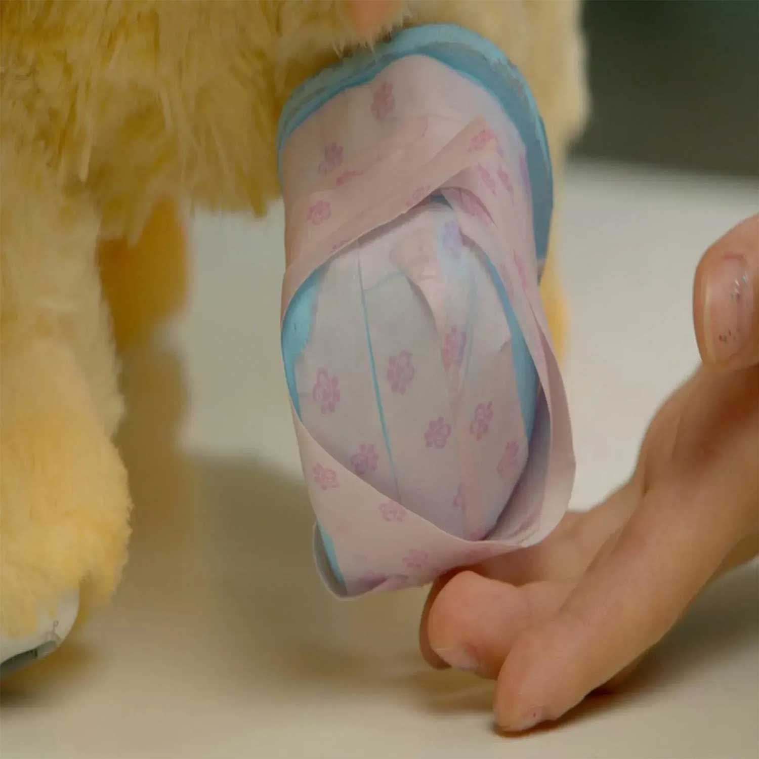 - смочите волшебные бинты водой и аккуратно обмотайте ими шину. Когда бинты высохнут, они превратятся в настоящий гипс
