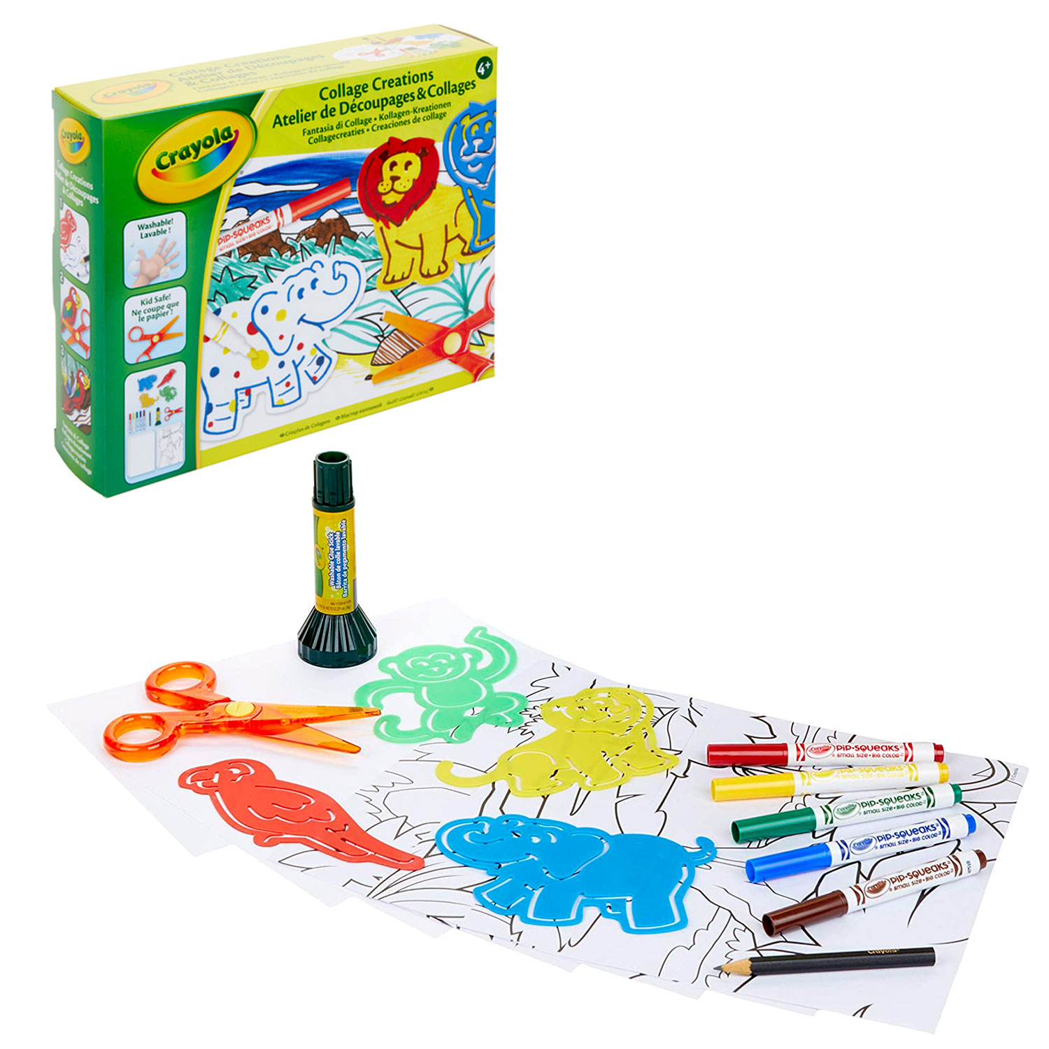 - вырезайте силуэты диких животных и птиц при помощи специальных детских безопасных ножниц, приклеивайте их в сюжетное полотно, используя клей в стике и раскрашивайте иллюстрацию смываемыми маркерами из набора
