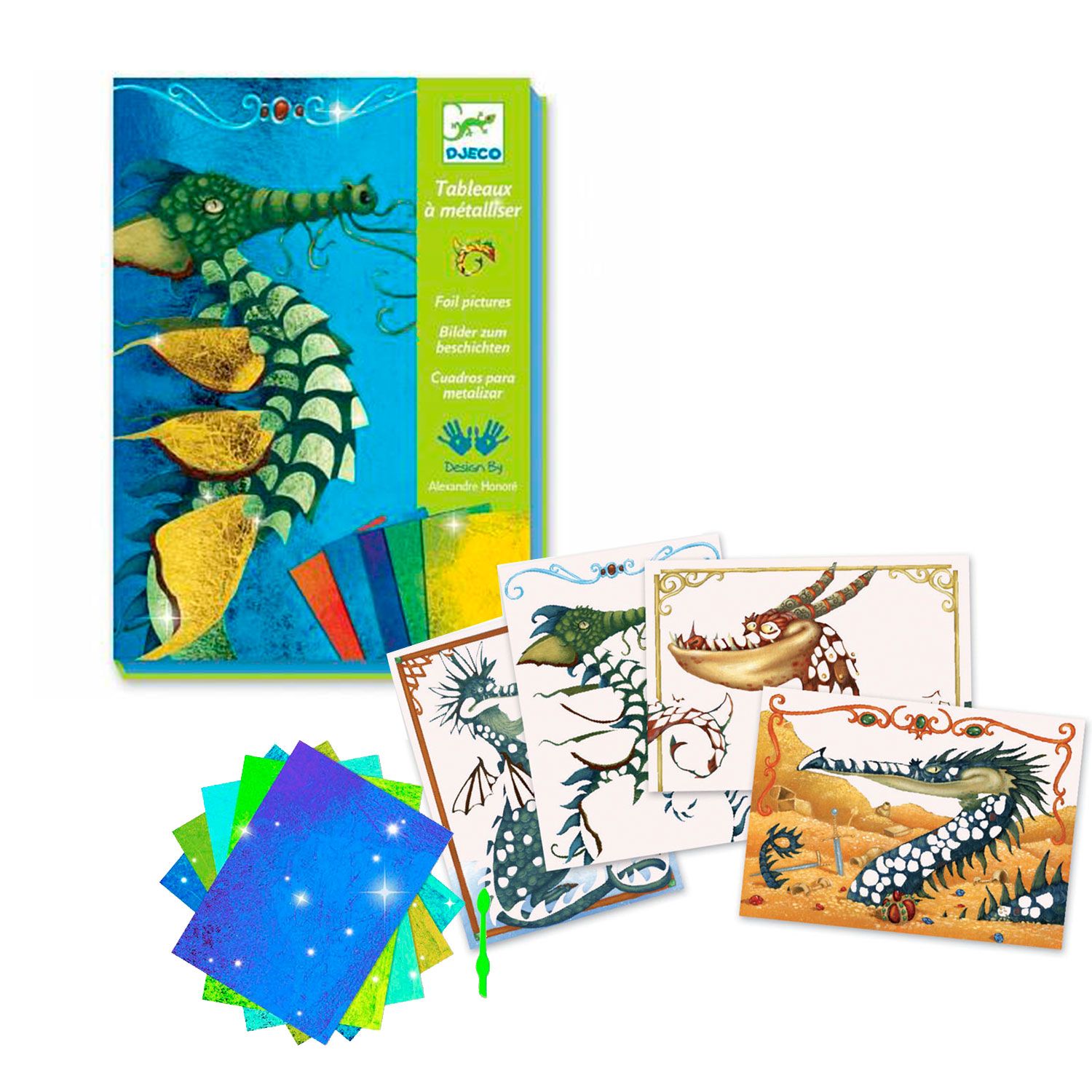 Набор для творчества «Гильдия драконов» от производителя «Djeco» подарит детям возможность увлекательно провести свой досуг, создавая красивые переливающиеся фольгой картинки с изображением доисторических драконов.
