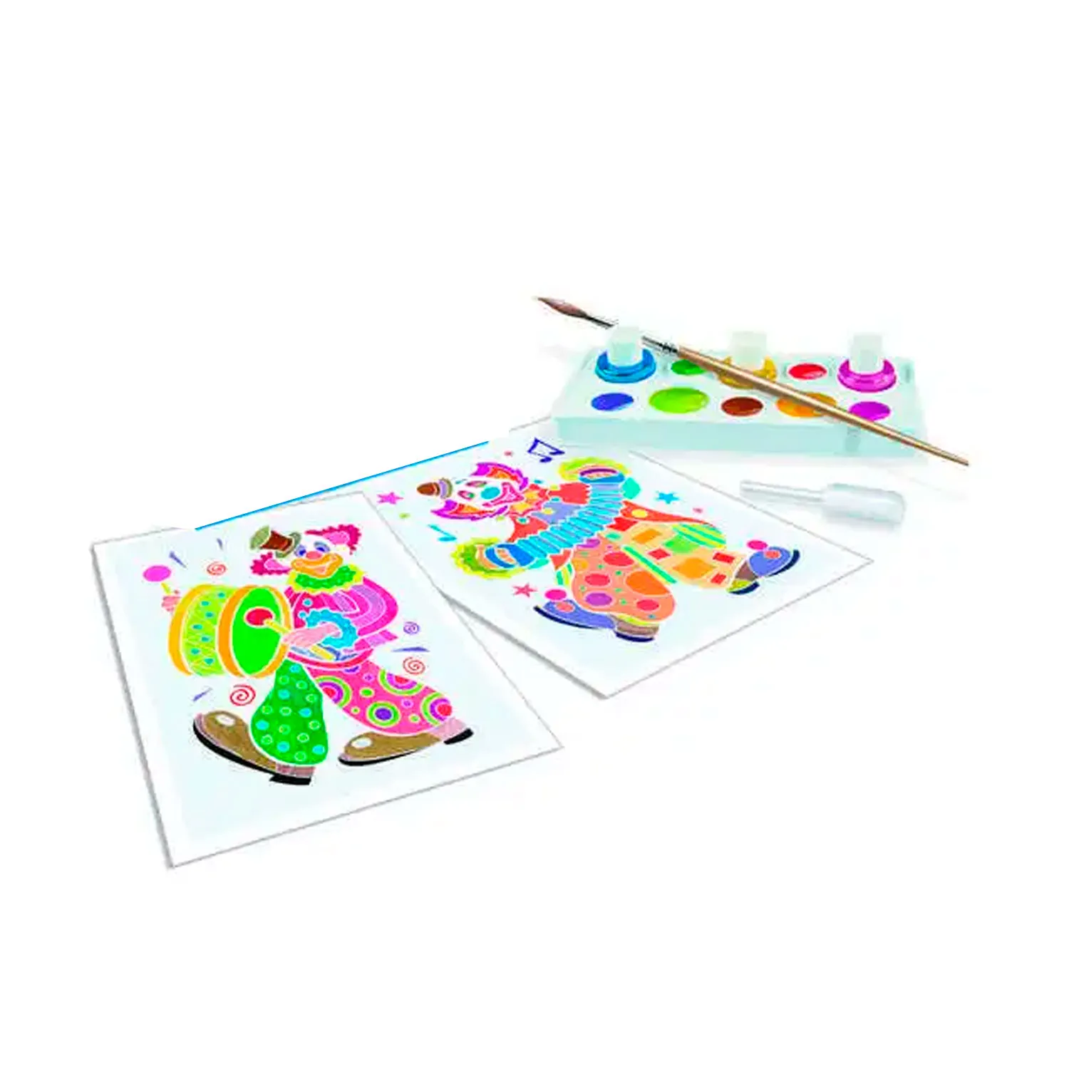 - в наборе представлены портреты клоунов, которые необходимо аккуратно раскрасить акварельными красками из набора