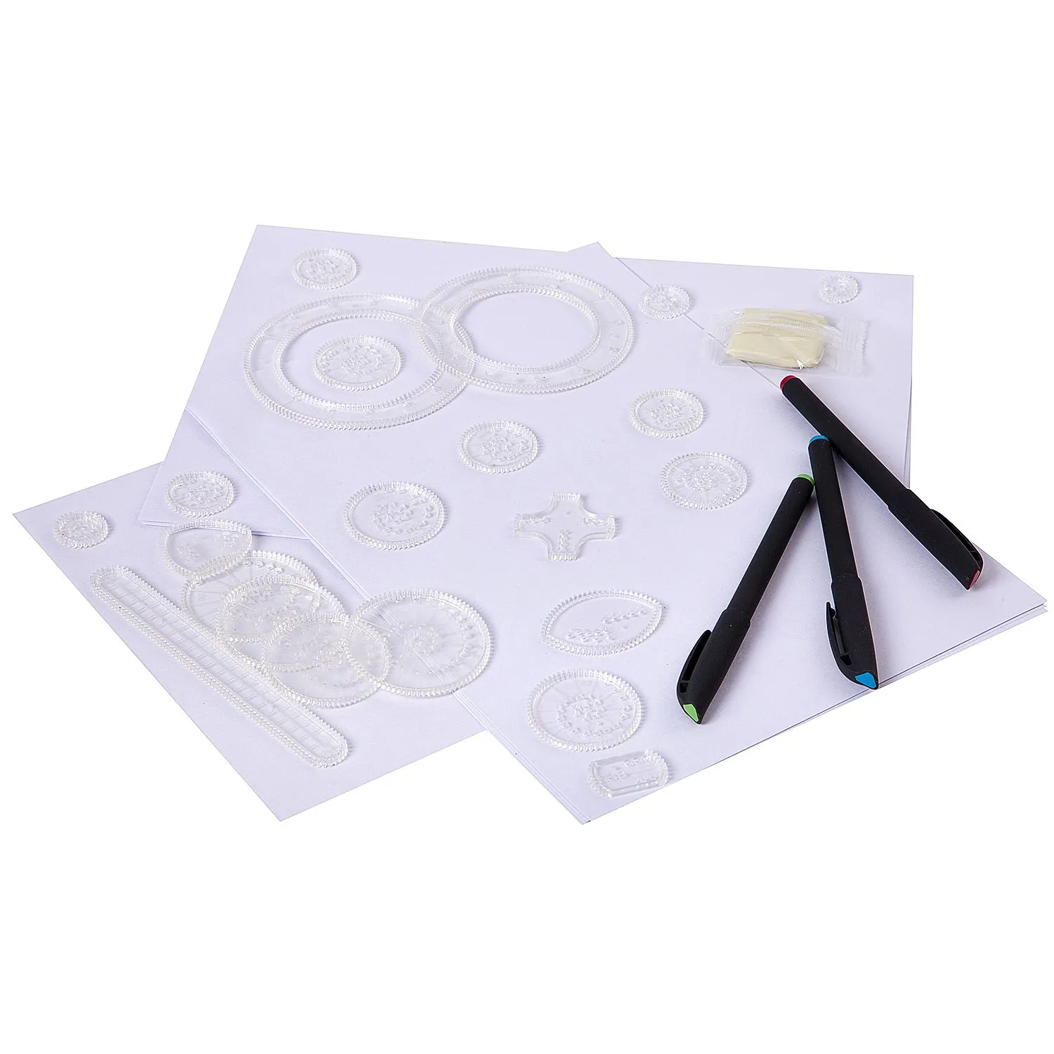 - чтобы начать, достаточно поместить один из трафаретов внутрь или наружу одного из больших кругов или линейки спирографа