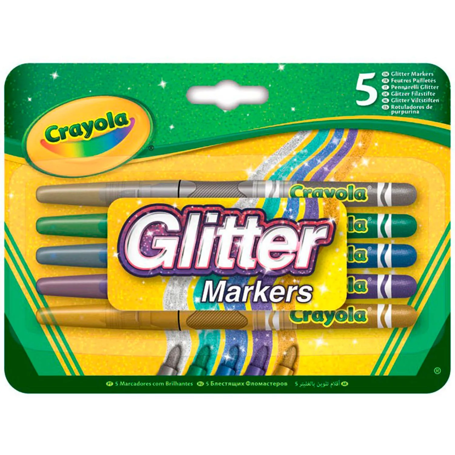 - набор блестящих фломастеров состоит из 5 фломастеров разных цветов серебристый, зеленый, синий, фиолетовый, золотой