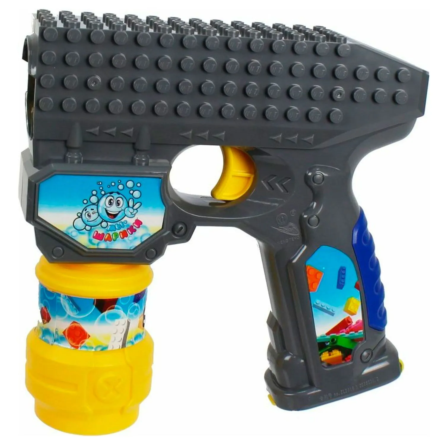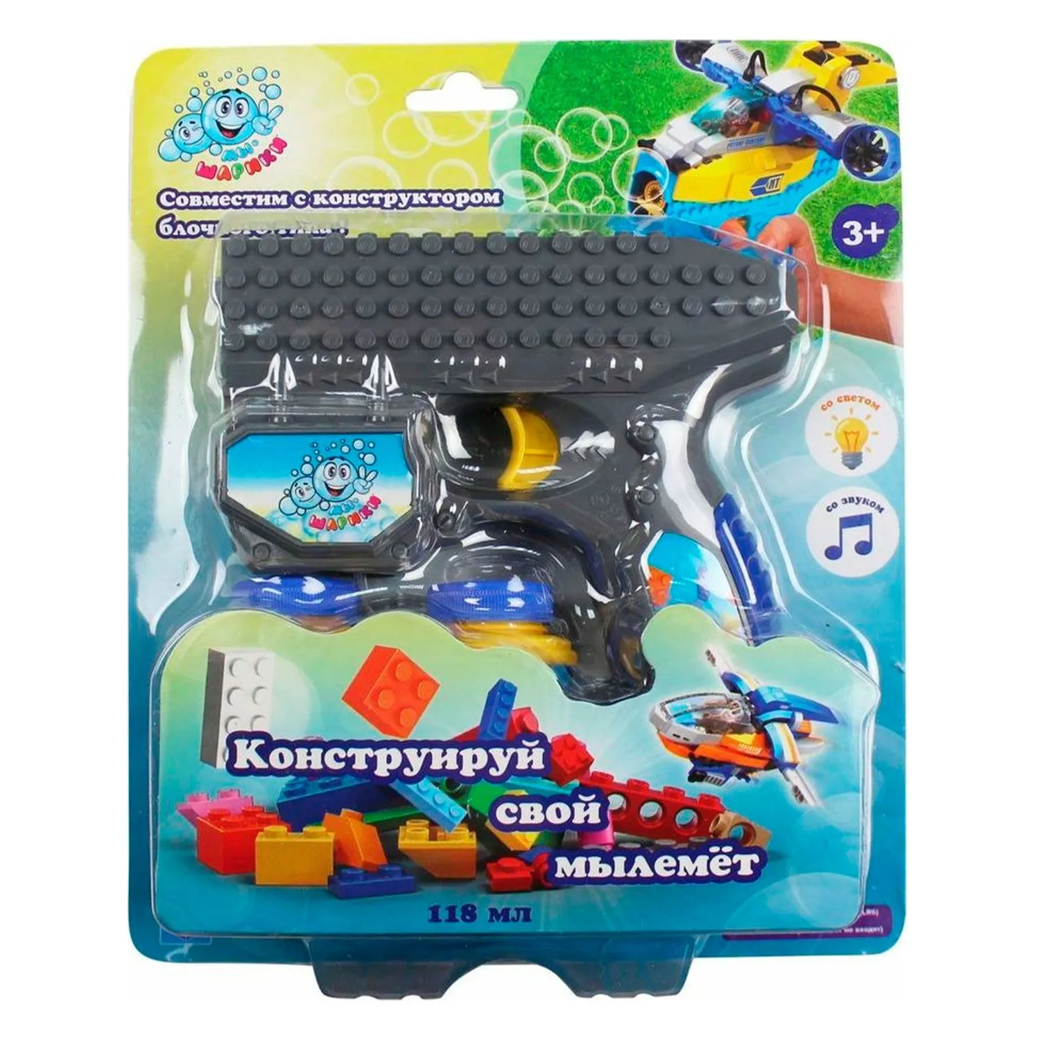 Из такого интересного пистолета с пазами, позволяющими разместить на нем детали конструктора, ваш ребенок будет выстреливать мыльными пузырями, а световые и звуковые эффекты дополнят его игру, делая ее более зрелищной и впечатляющей.