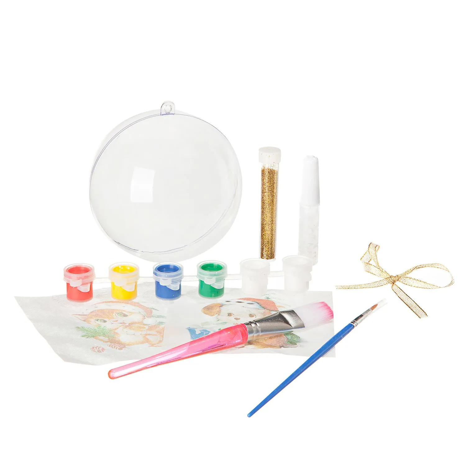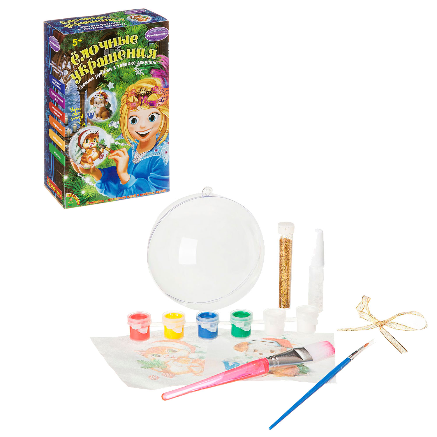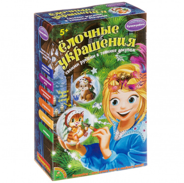 Набор для творчества – создание ёлочных украшений своими руками. Согласно инструкции ребёнок может легко и непринуждённо освоить технику декупаж.