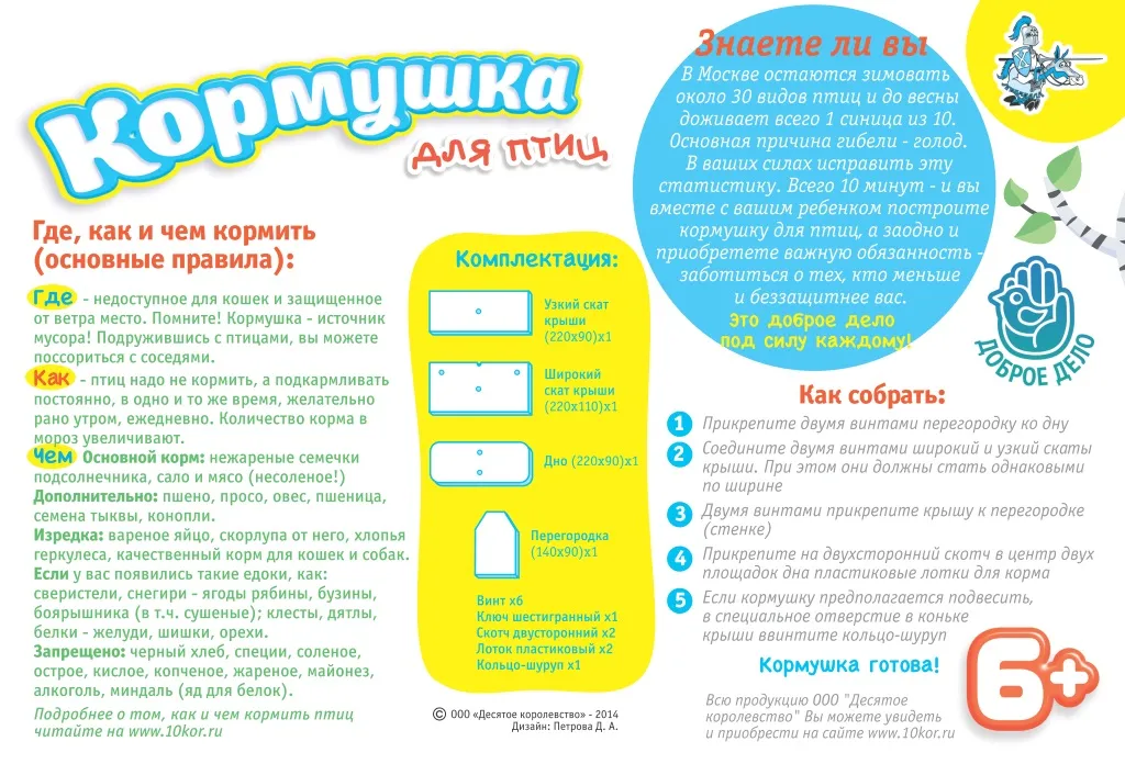 В наборе есть все необходимое, чтобы сделать доброе дело, построить домик для птиц. Такой домик-кормушка особенно пригодится для тех птиц, которые не улетают зимовать. Мастерить кормушку можно всей семьей, ведь совместный труд объединяет.