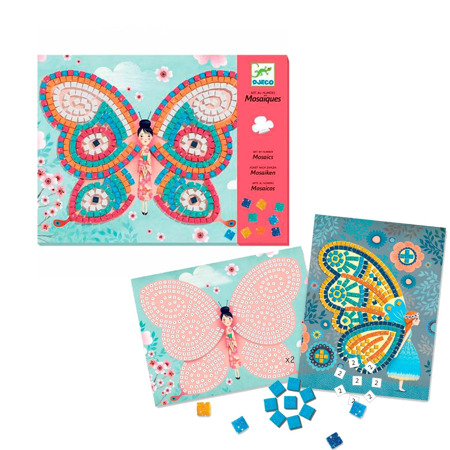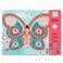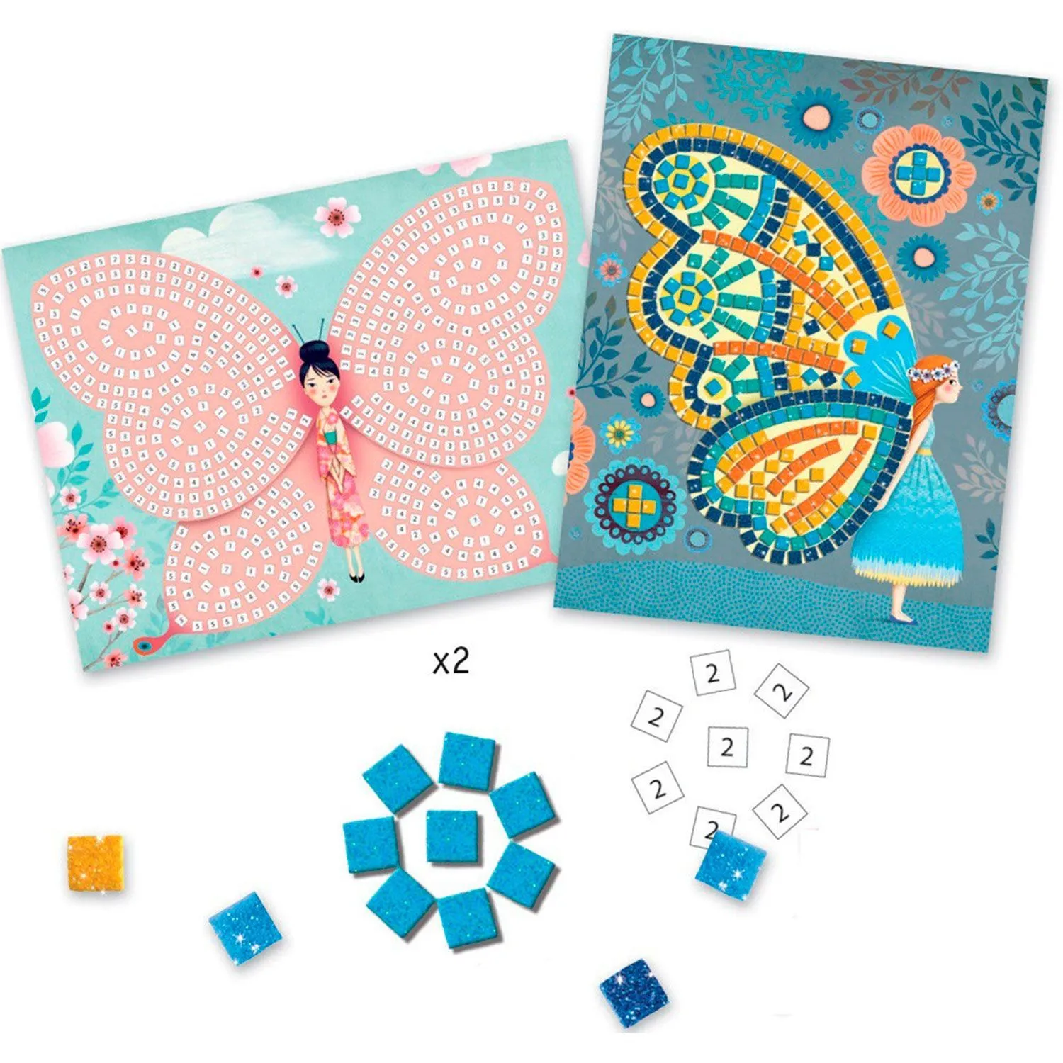 - две красочные картинки, которые ребенок должен создать путем наклеивания цветных квадратиков с блестками в соответствующие формы с цифрами