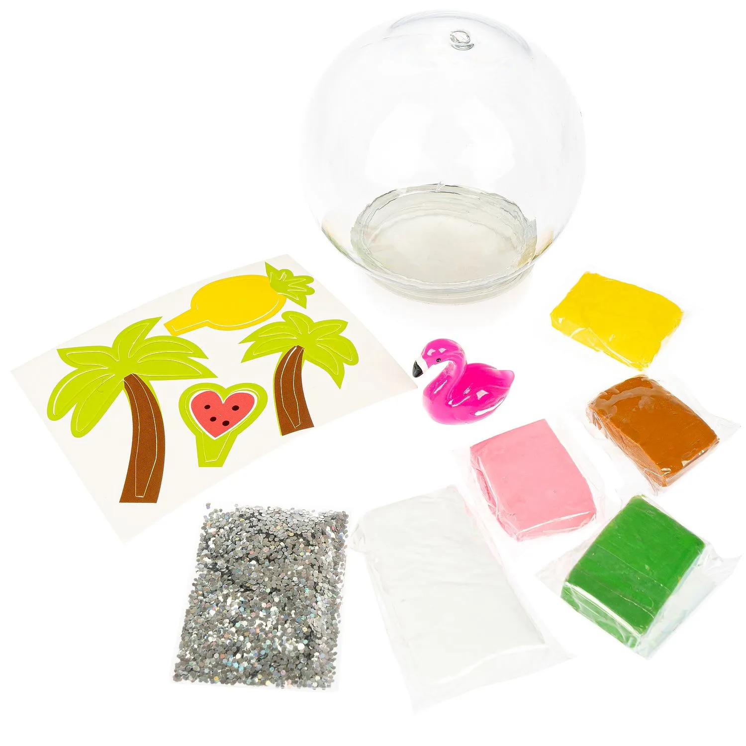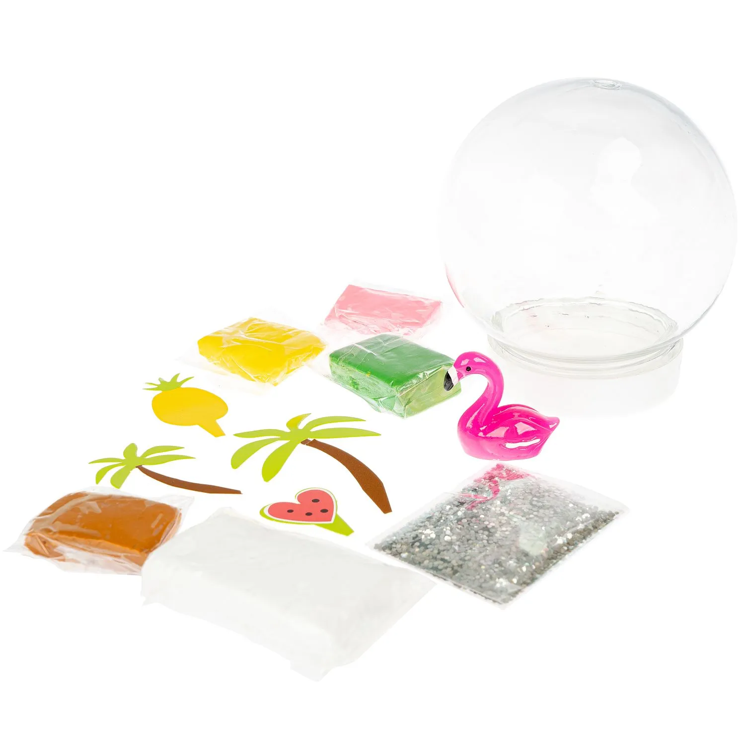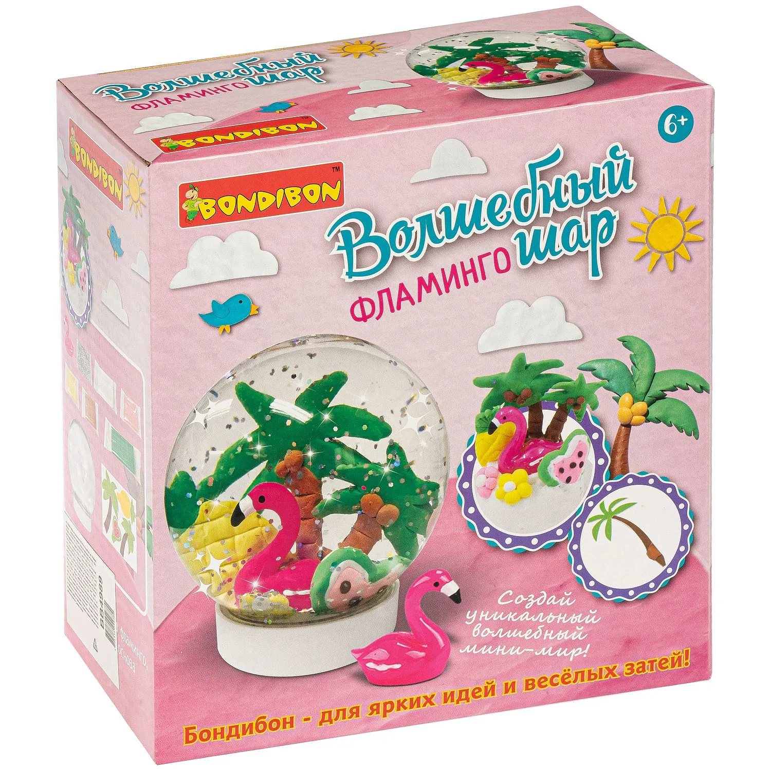 - для этого вылепи композицию, покрывая бумажные основы пластилином, размести все готовые элементы внутри шара, добавь фигурку розового фламинго