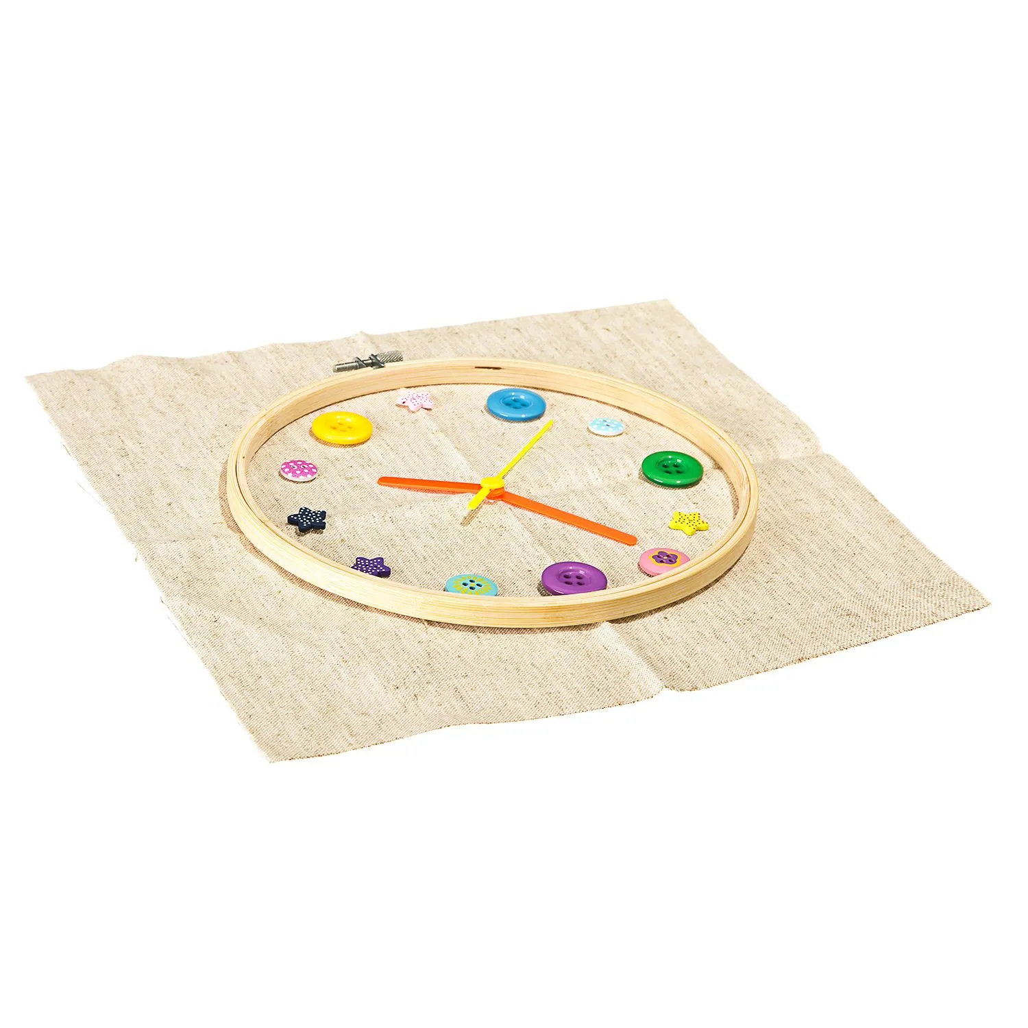 Настоящие часы, сделанные из необычных материалов - пяльцев для вышивки, хлопка и цветных пуговок - станут необычным и стильным акцентов детской комнаты.