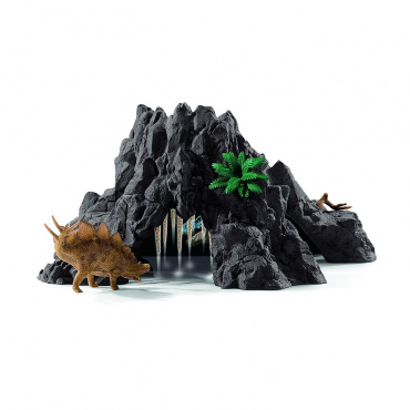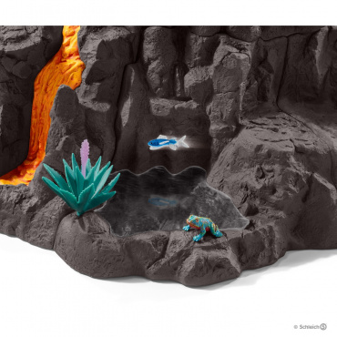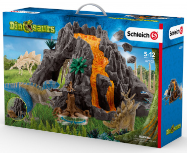 Из элементов набора дети смогут собрать макет вулкана с падающей раскаленной лавой, пещерой, небольшим водоемом и дополнить его реалистичной фигуркой динозавра для увлекательной игры.