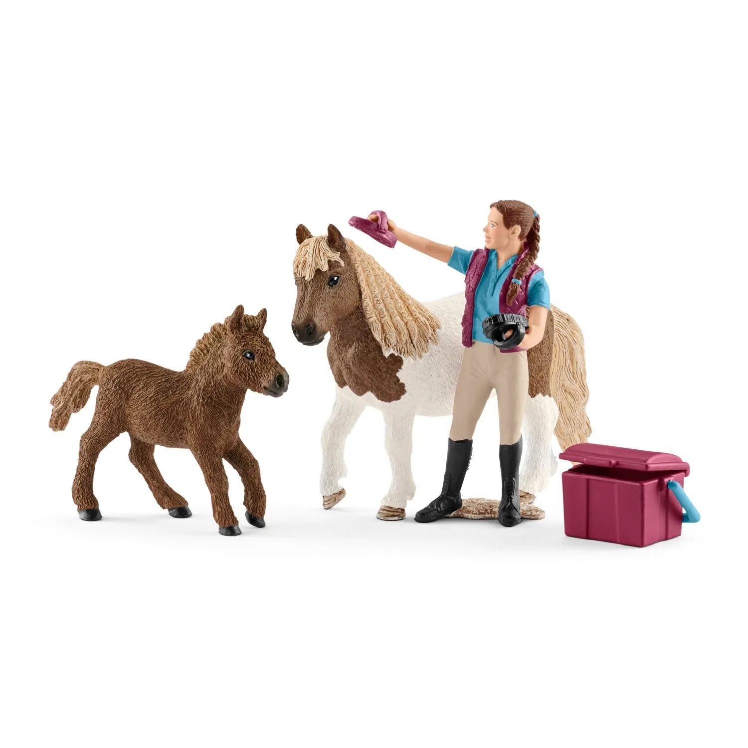 Набор состоит из двух фигурок пони, большой и маленькой, а также фигурки конюха - милой девушки, по которой сразу видно, как сильно она любит заботиться о животных.