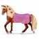 Пасо Фино – красивый жеребец, который с успехом сможет выступить на лошадином шоу,в качестве украшения на шоу приготовлена красивая сиреневая попона с цветочным узором, а в гриву вплетены бутоны роз.